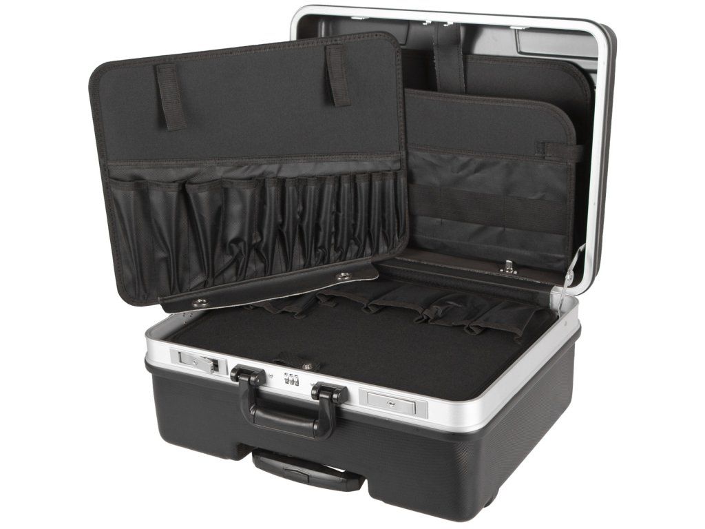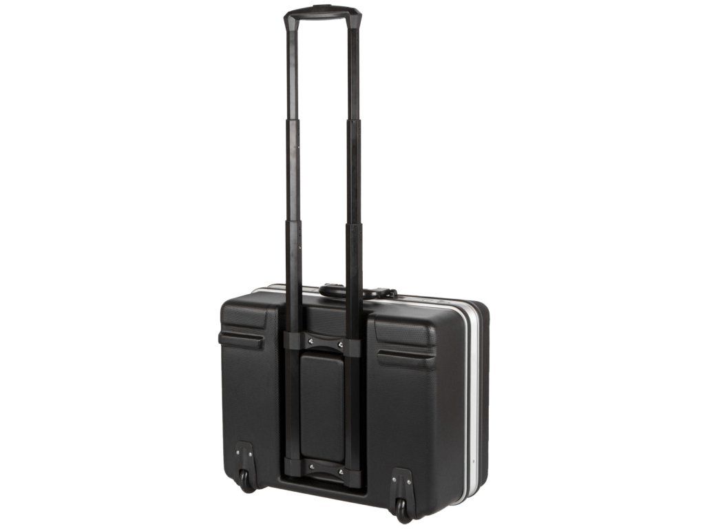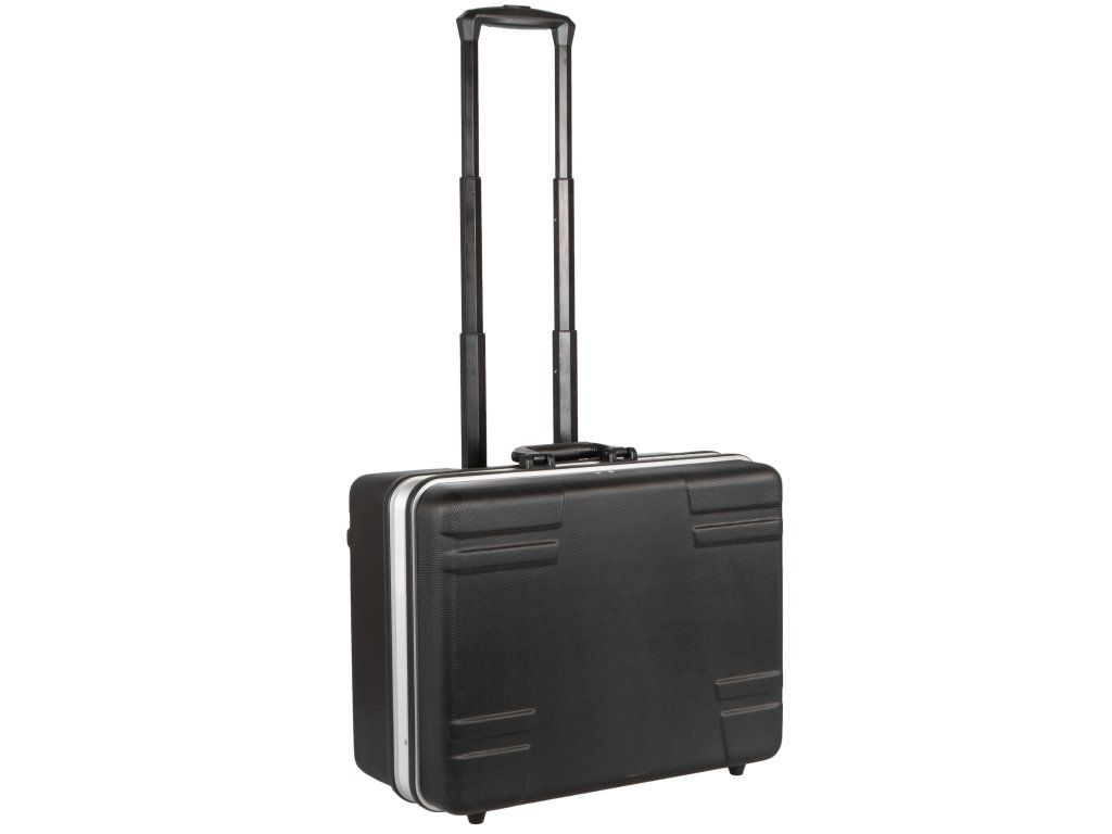 Kufr na nářadí o rozměrech (š x h x v): 480 x 360 x 240 mm. Kufr je lehce přenosný díky kolečkům a teleskopickému madlu.