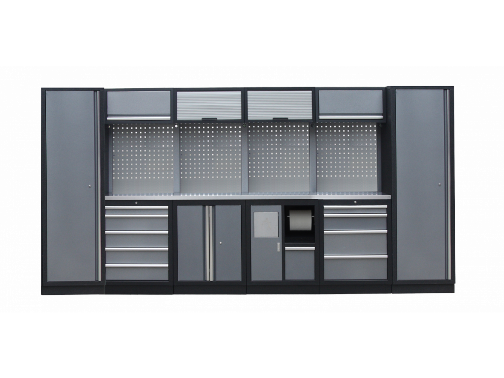 Sestava nábytku v sobě skrývá dostatečné množství úložného prostoru pro vaše nářadí, autotechniku i dílenské vybavení. V kombinaci s bytelnou pracovní deskou získáte multifunkční stěnu, se kterou vám půjde práce od ruky ve všech směrech.