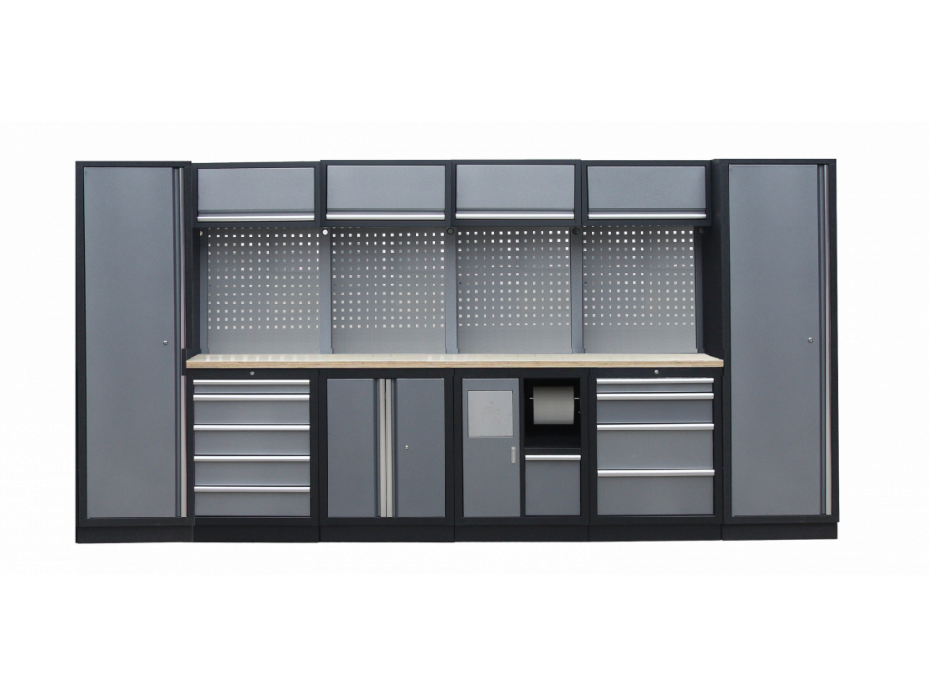 Sestava nábytku v sobě skrývá dostatečné množství úložného prostoru pro vaše nářadí, autotechniku i dílenské vybavení. V kombinaci s bytelnou pracovní deskou získáte multifunkční stěnu, se kterou vám půjde práce od ruky ve všech směrech.