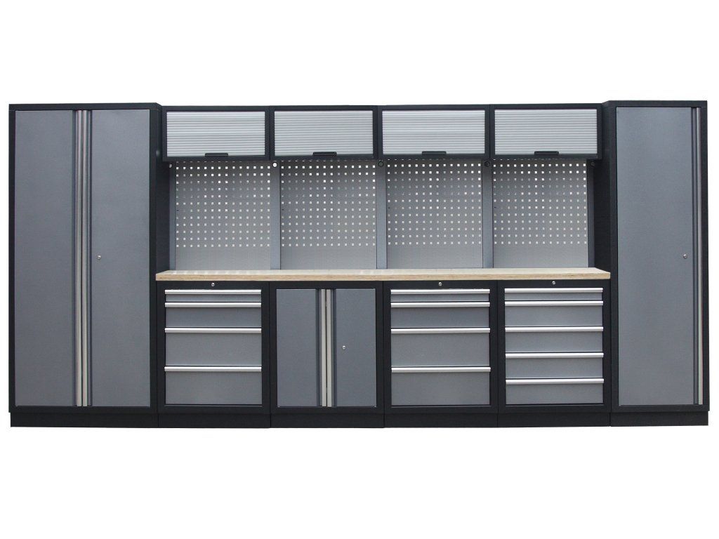 Sestava nábytku v sobě skrývá dostatečné množství úložného prostoru pro vaše nářadí, autotechniku i dílenské vybavení. V kombinaci s bytelnou pracovní deskou získáte multifunkční stěnu, se kterou vám půjde práce od ruky ve všech směrech.