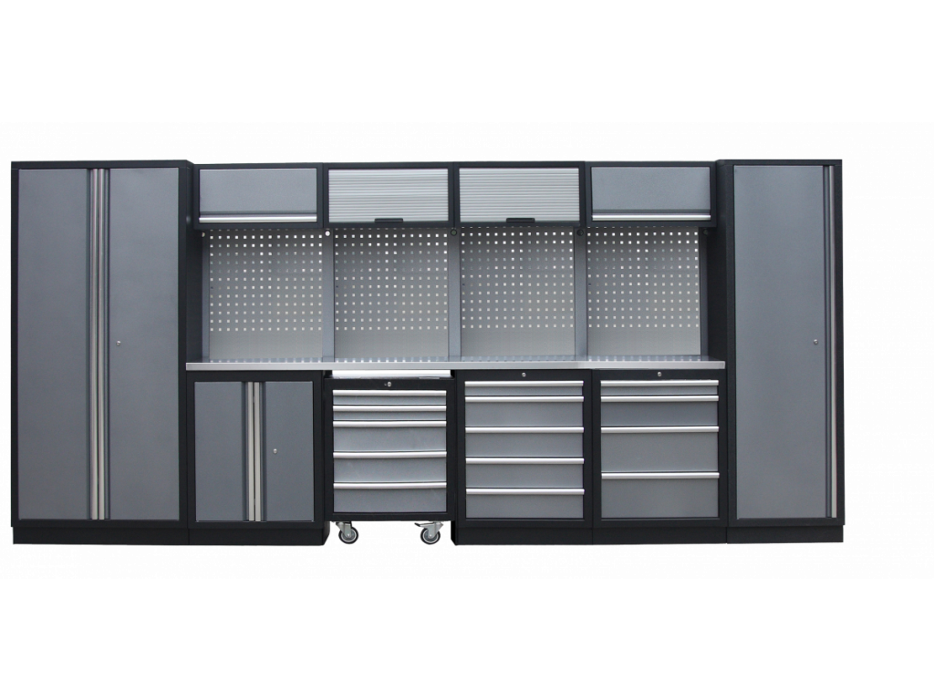 Sestava dílenského nábytku ve vysoké kvalitě, který je vhodný pro profesionální servisy i domácí garáže a dílny. Nábytek je celokovový s kovovou pracovní deskou. Sestava 21 ks dílenského nábytku udrží nářadí přehledně uklizené na správném místě.