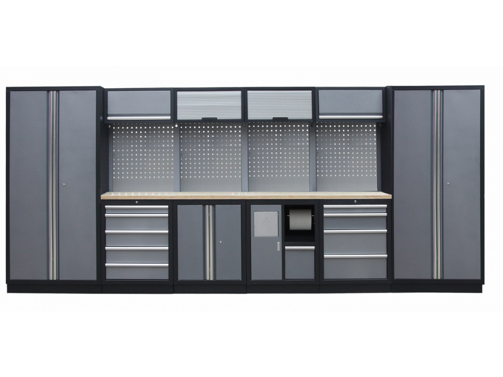 Sestava nábytku v sobě skrývá dostatečné množství úložného prostoru pro vaše nářadí, autotechniku i dílenské vybavení. V kombinaci s bytelnou pracovní deskou získáte multifunkční stěnu, se kterou vám půjde práce od ruky ve všech směrech.
