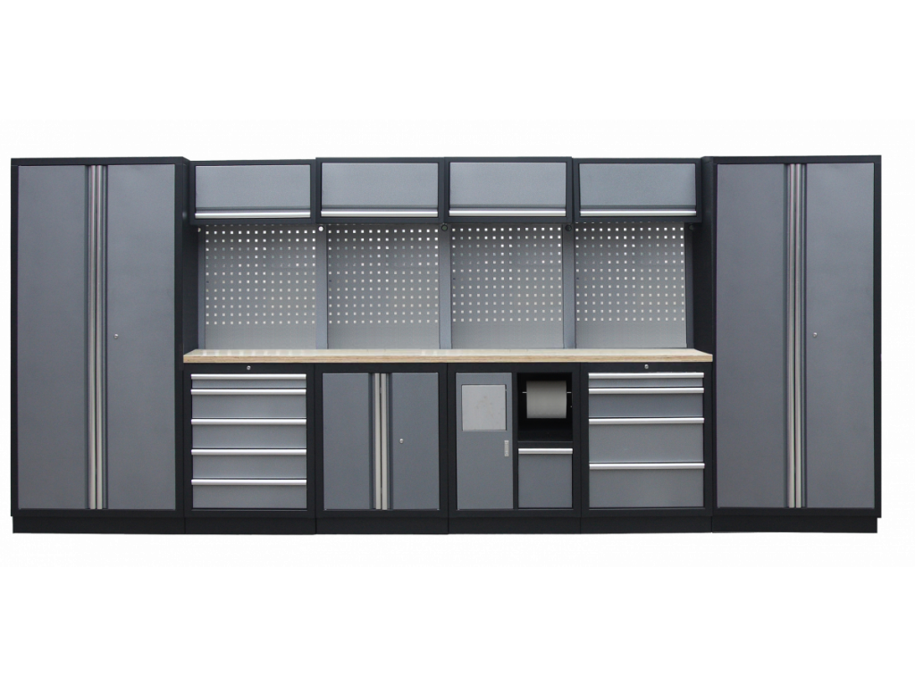 Sestava nábytku v sobě skrývá dostatečné množství úložného prostoru pro vaše nářadí, autotechniku i dílenské vybavení. V kombinaci s bytelnou pracovní deskou získáte multifunkční stěnu, se kterou vám půjde práce od ruky ve všech směrech.