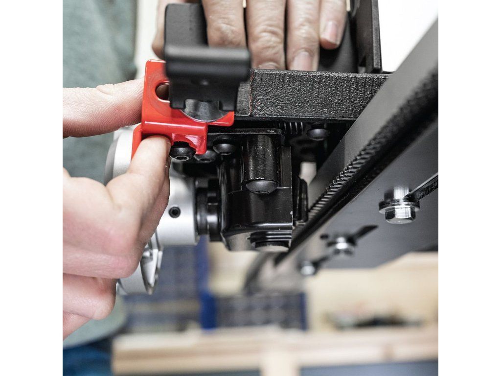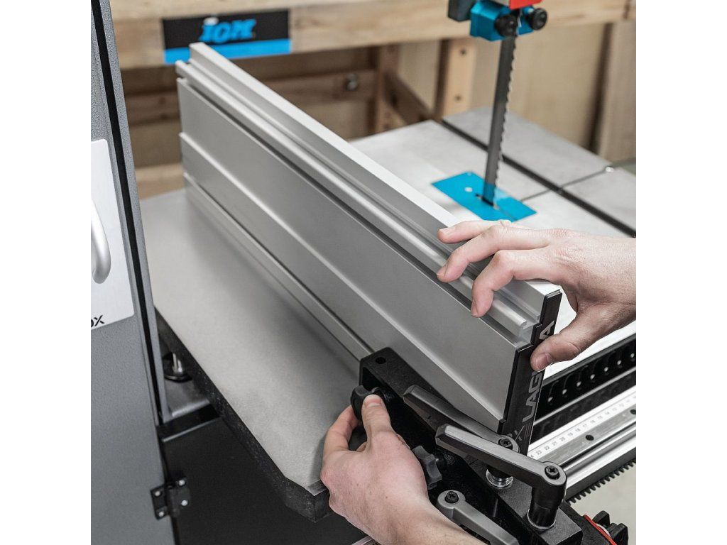 Univerzální podélné pravítko DX3 DriftMaster s robustním lineárním vedením dodá vaší pásové pile nový rozměr práce. Pravítko se podél stolu pily pohybuje na pevném ozubeném převodu s maximální přesností. Posuv po stole je ovládaný klikou na přední straně pravítka, kterou lze snadno přepnout do režimu rychloposuvu uvolněním páky a vyklopením červeného posuvníku. Vysoký hliníkový profil lze nejen umístit do vertikální nebo horizontální polohy, ale také naklopit o 10° doprava i doleva. Toto nastavení úhlu bočního vedení se provádí jednoduše otáčením kola na levém boku pravítka. Řez bude vždy přesný díky aretaci profilu, úhlu bočního vedení a posuvu. Pravítko je mimo jiné vybavené dorazem pro opakovací řezy.
