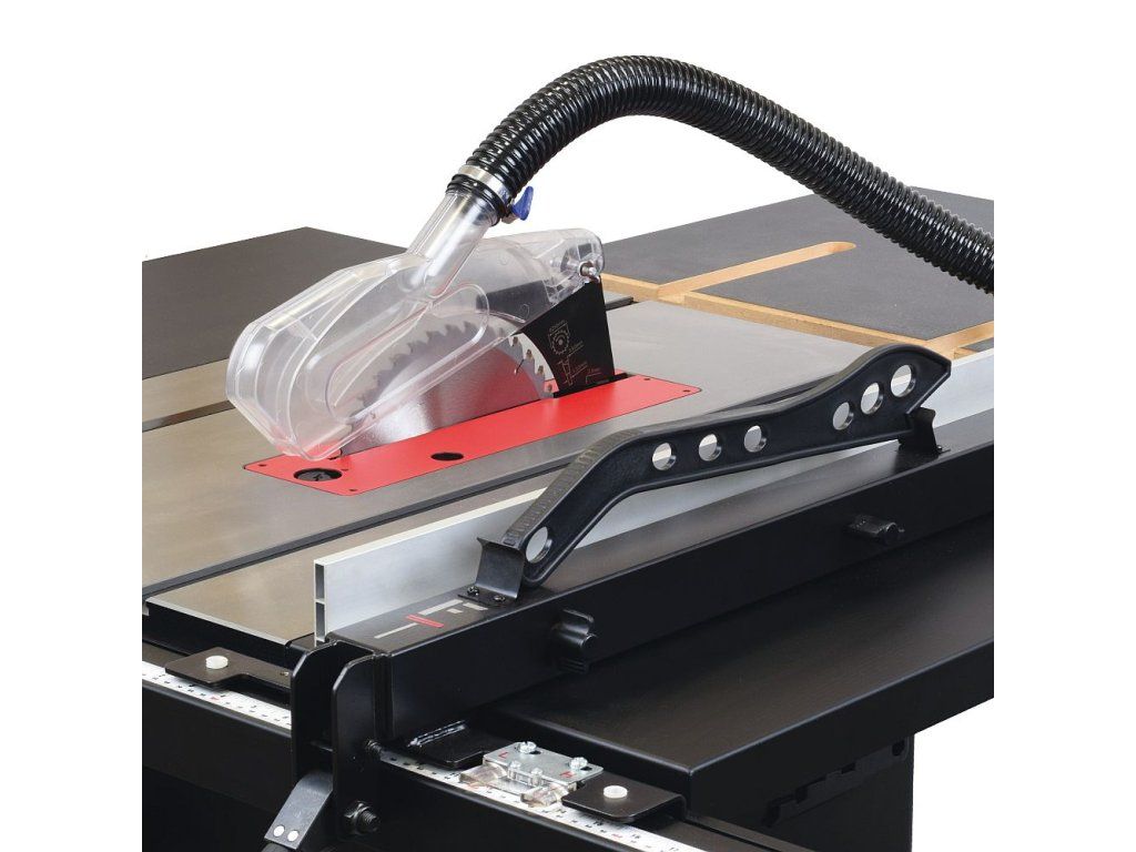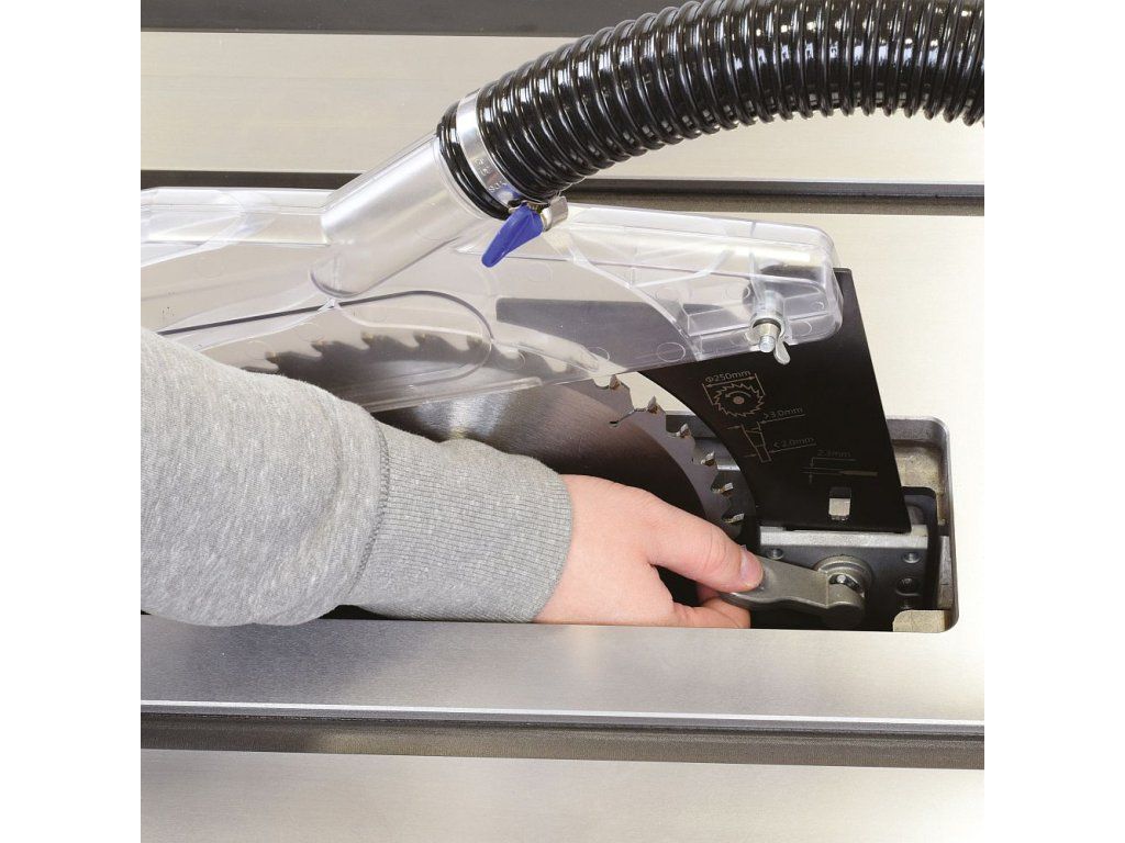 Kovová ovládací kola zajišťují lehké a přesné naklopení pilového kotouče od 0° do 45° a zdvih pilového kotouče nahoru a dolů podle vaší potřeby. Pila má důmyslně řešené odsávání pilin ze spodní části i z horního odsávacího krytu od pilového kotouče. Odsávání prachu umístěné v krytu pilového kotouče, poskytuje čistou pracovní plochu pro přesné a komfortní řezání. Pro připojení odsavače pilin je v zadní části těla zabudované 100 mm kovové hrdlo.