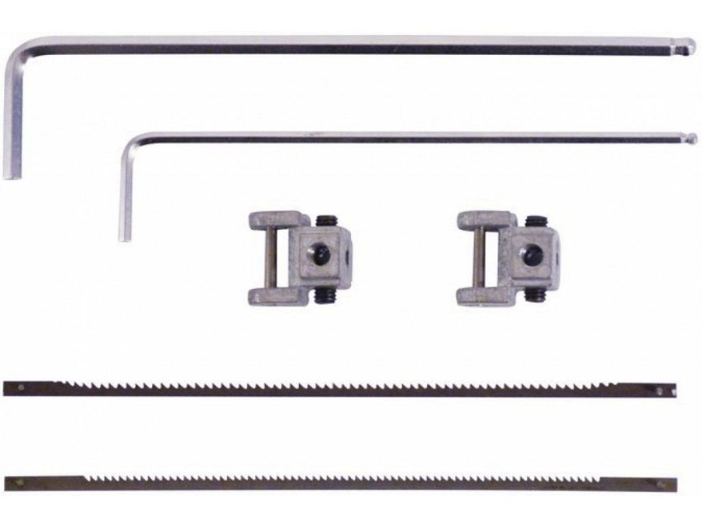 Příslušenství: náhradní pilové listy (→ 2; 133 x 3 x 0,5 mm), upínací kulisy pro pilová lanka (2), šestihranné klíče (2).
