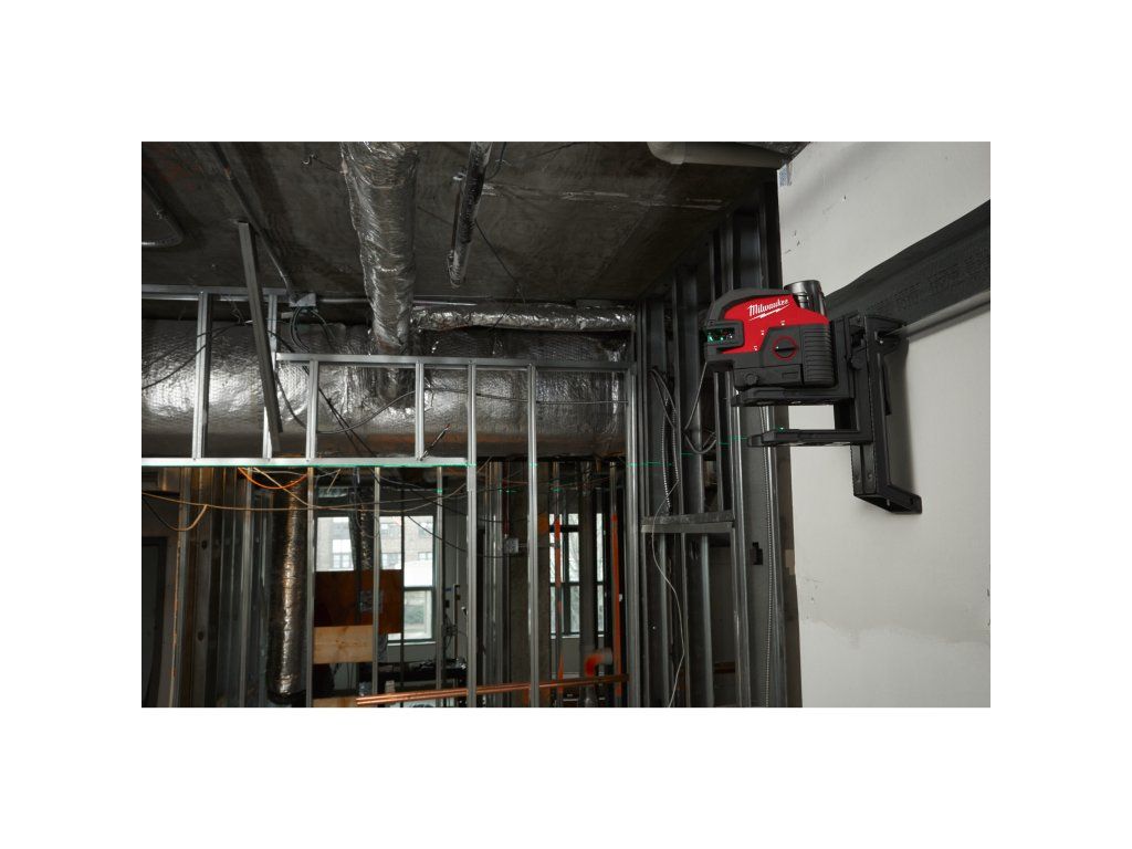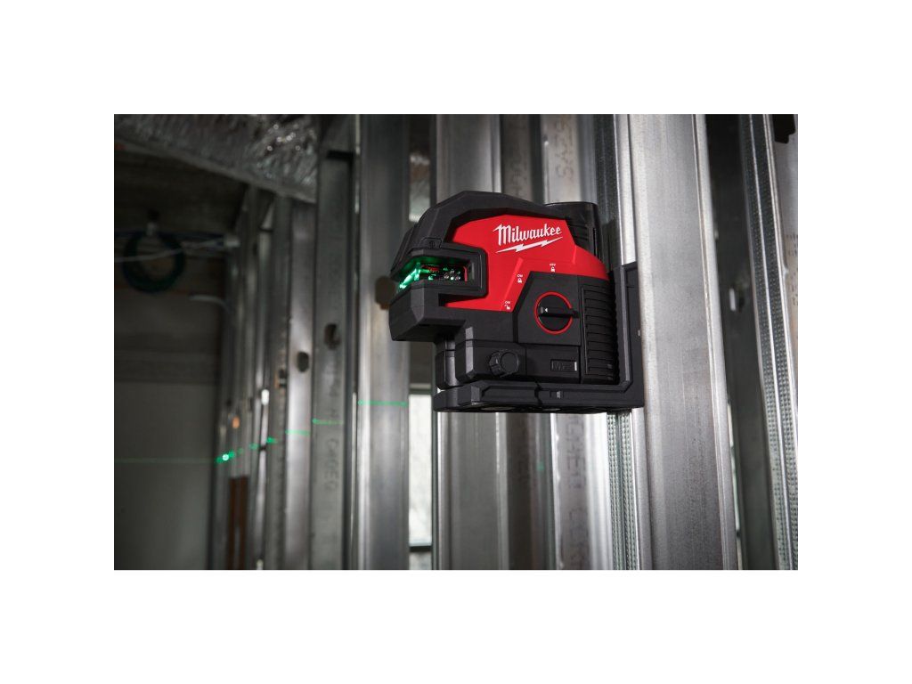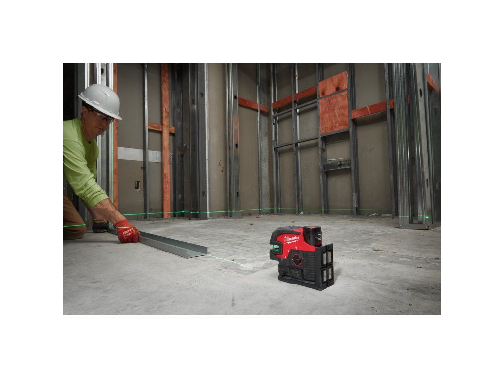 - Zelený křížový liniový laser M12™ se 4 body nabízí všechny funkce v jednom výrobku: horizontální srovnání, vertikální srovnání, přenos bodu z podlahy na strop a horizontální přenos bodu