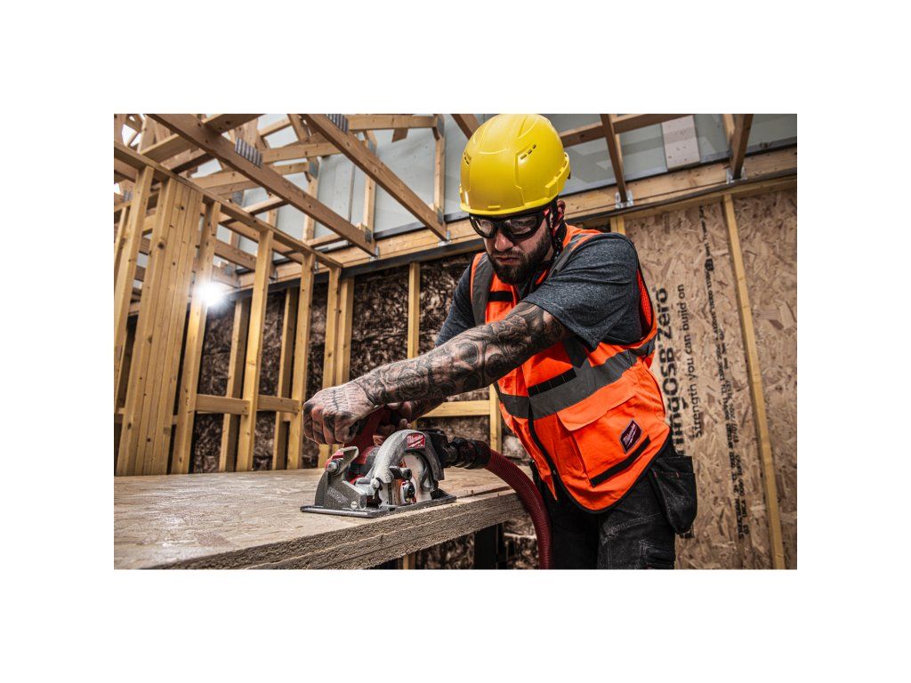 - 165 mm pilový kotouč s hloubkou řezu 57 mm, který umožňuje proříznout hromadu desek OSB 3x 18 mm.