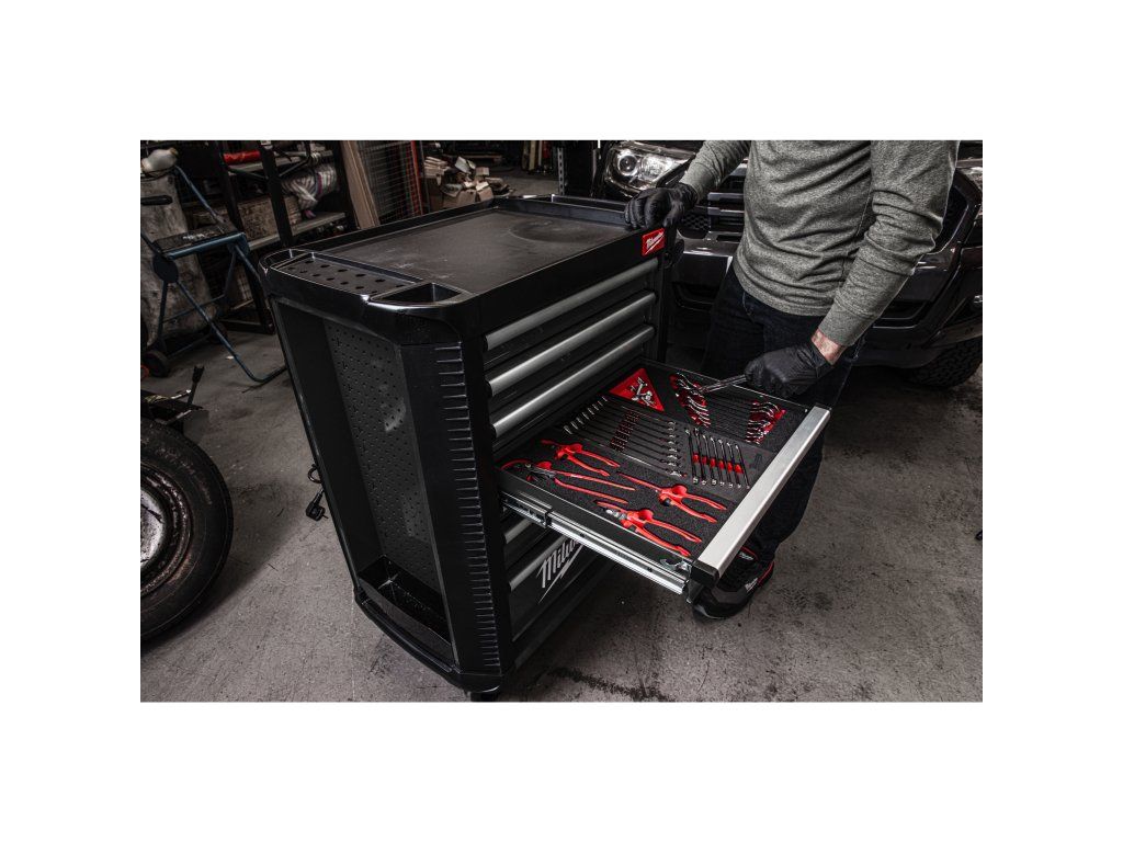 - 5 zásuvek naplněných základním nářadím potřebným pro údržbu automobilů, přehledně umístěných v pěnových vložkách pro co nejlepší organizaci.