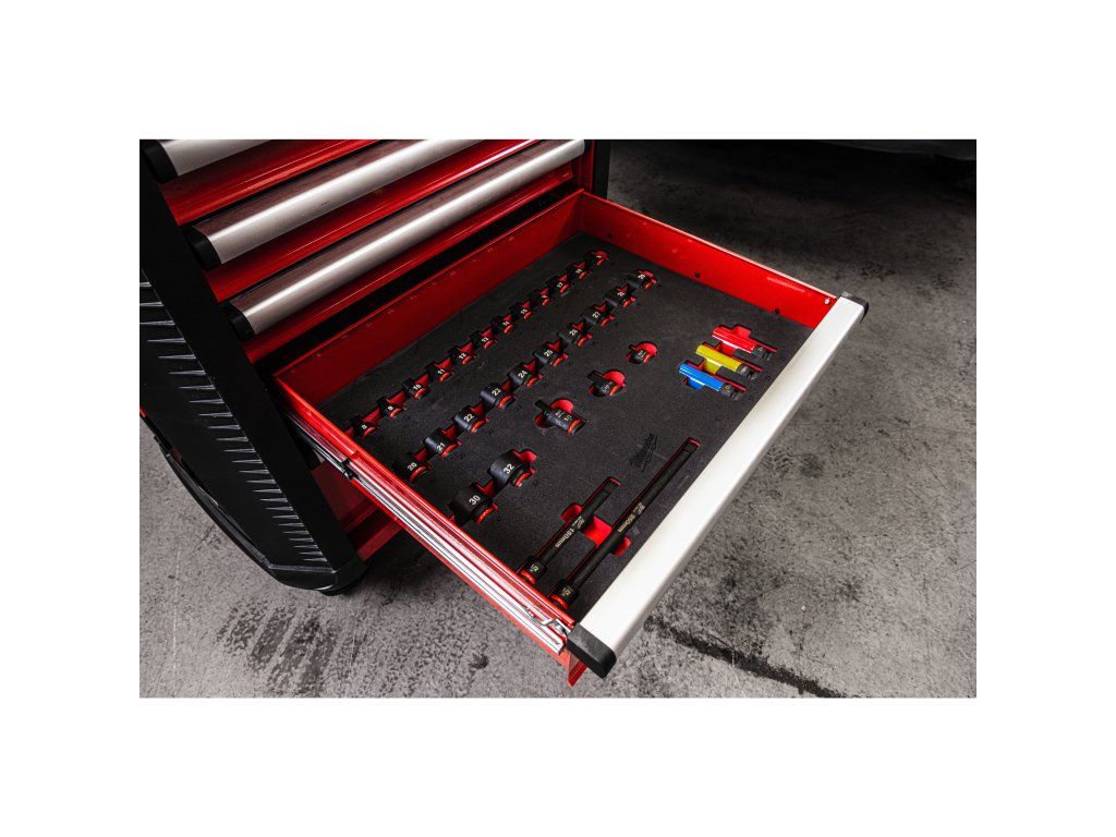 - 5 zásuvek naplněných základním nářadím potřebným pro údržbu automobilů, přehledně umístěných v pěnových vložkách pro co nejlepší organizaci.