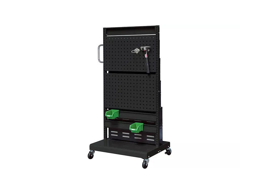 Jedna strana stojanu je osazena výklopnými boxy čtyř velikostí s průhlednými čely, druhá je tvořena děrovanými deskami s možností zavěšení háčků, držáků a doplňkových boxů. Manipulaci usnadňuje kovové madlo po straně rámu.
