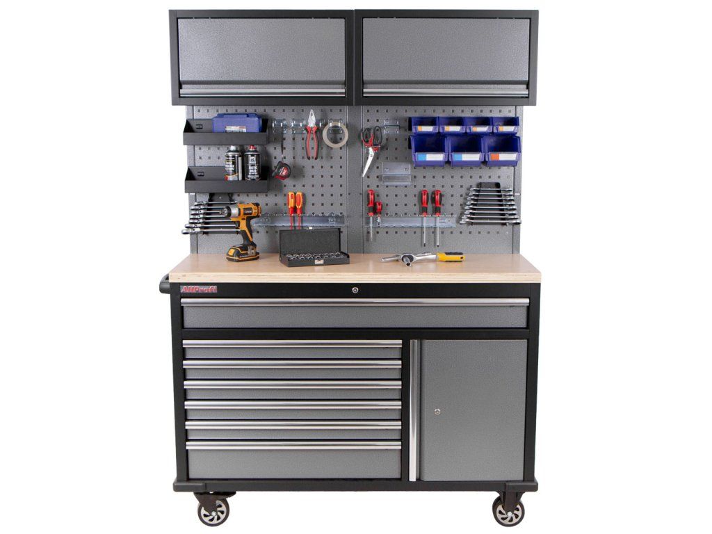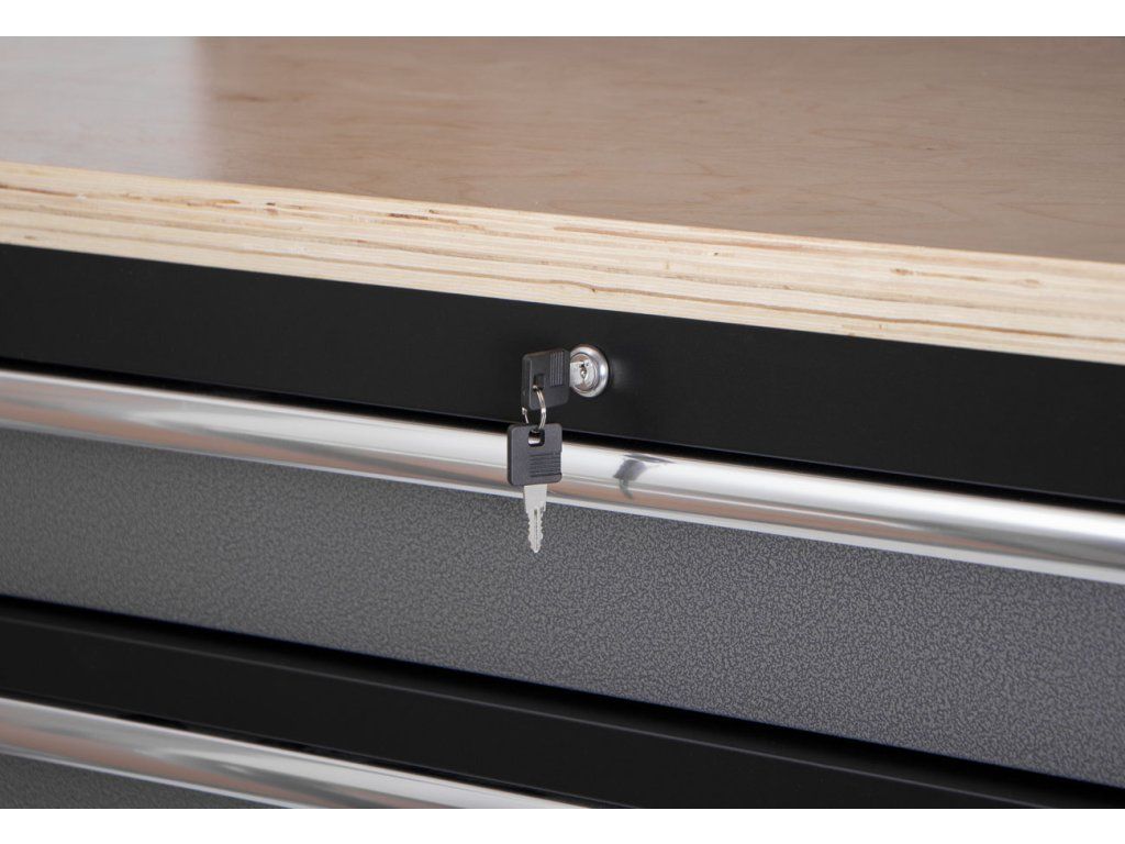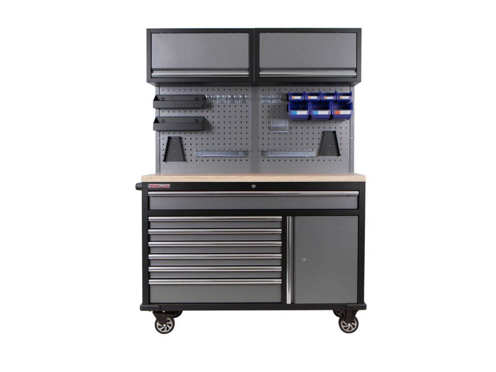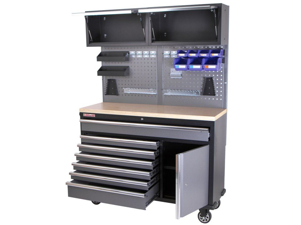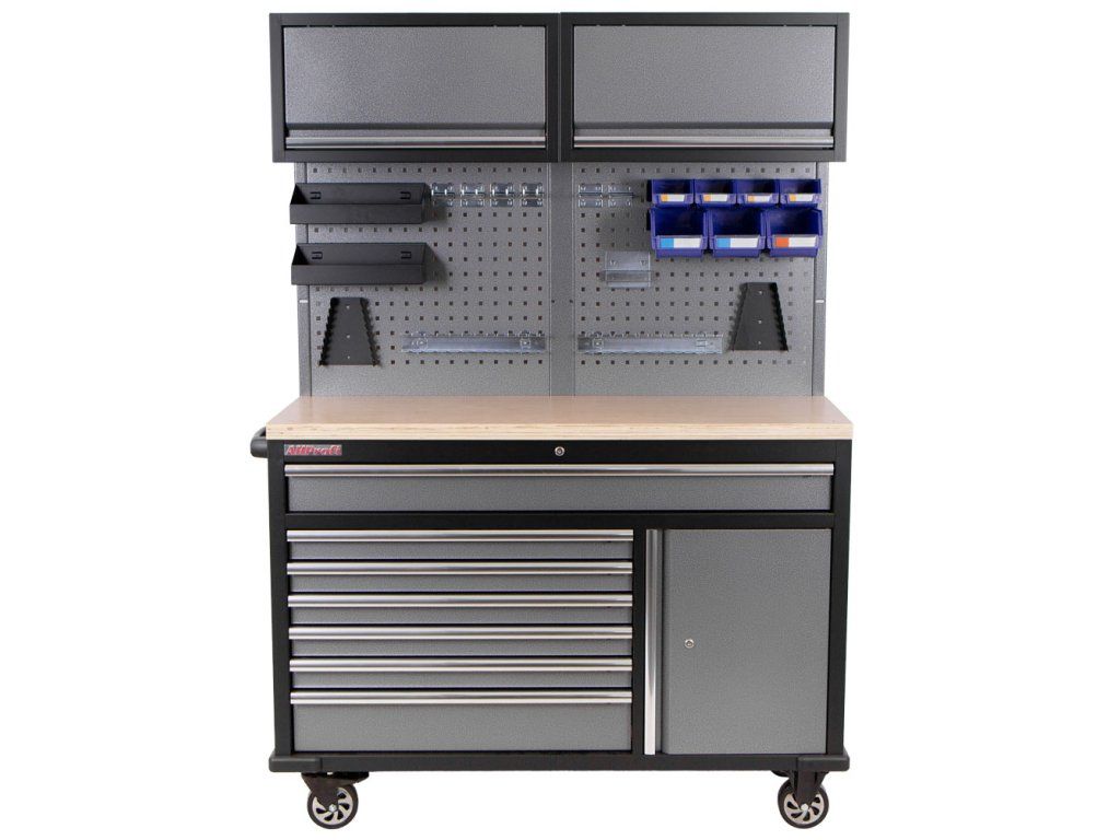 Dílenský vozík z řady nábytku PROFI GREY kombinuje pracovní plochu z odolného dřeva o rozměrech 1360 x 465 x 35 mm s bohatým úložným prostorem, který zahrnuje 2 horní skříňky, 7 zásuvek a 1 spodní skříňku.