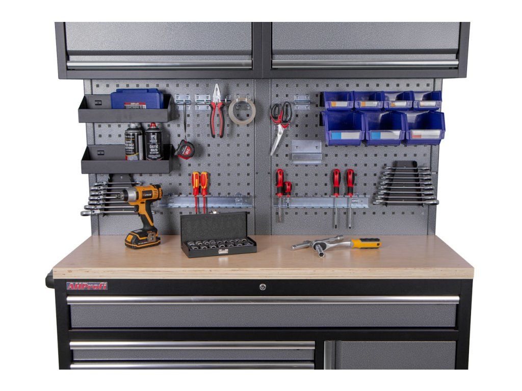 Perforovaná deska s roztečí děr 38 mm umožňuje efektivní organizaci nářadí pomocí přiloženého praktického příslušenství.