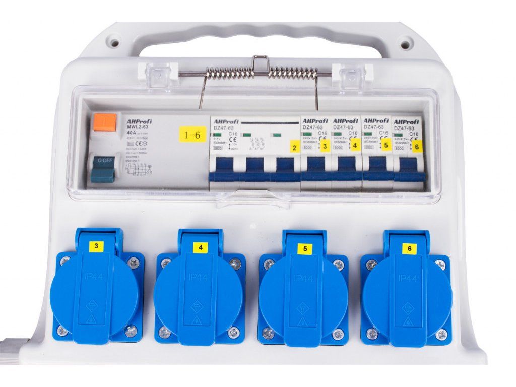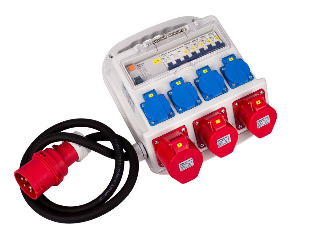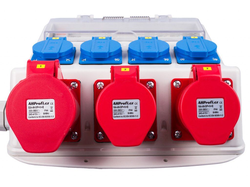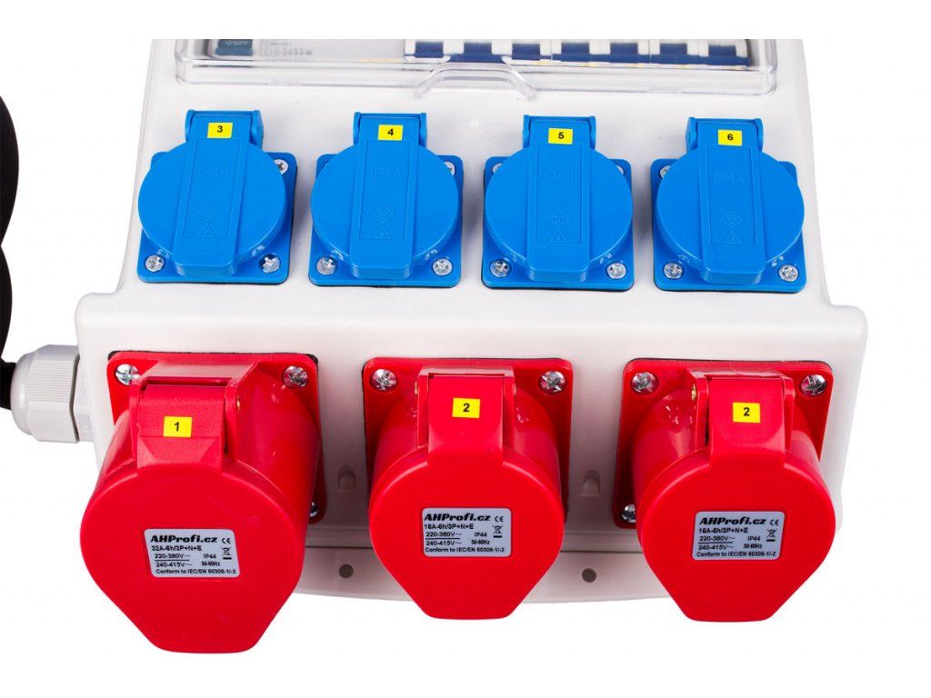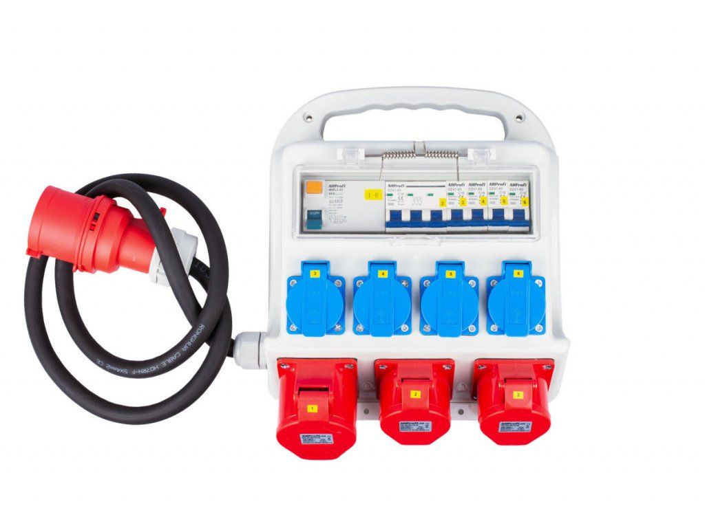 Rozvodná skříň má kabel se vstupem 32A 5P o délce 140 cm. Dále má 7 výstupů, 4 zásuvky 16A, 2 zásuvky 16A 5P a zásuvku 32A 5P.
