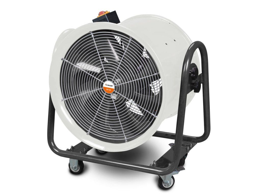 Mobilní ventilátor vhodný pro odvádění teplého vzduchu, dýmu, prachu, plynů, zápachu a jinak zatíženého vzduchu.