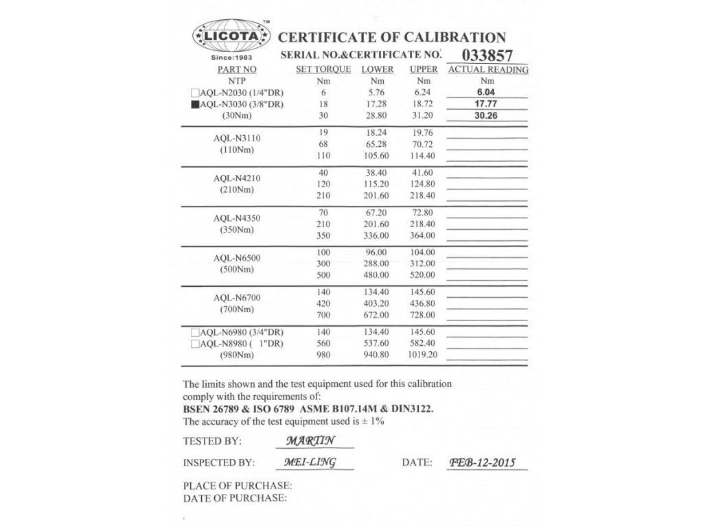 Momentový klíč od značky LICOTA se 3/8" je vyroben z kvalitní chrom-vanadiové oceli s pracovním rozsahem 6 - 30 Nm a certifikátem kalibrace.