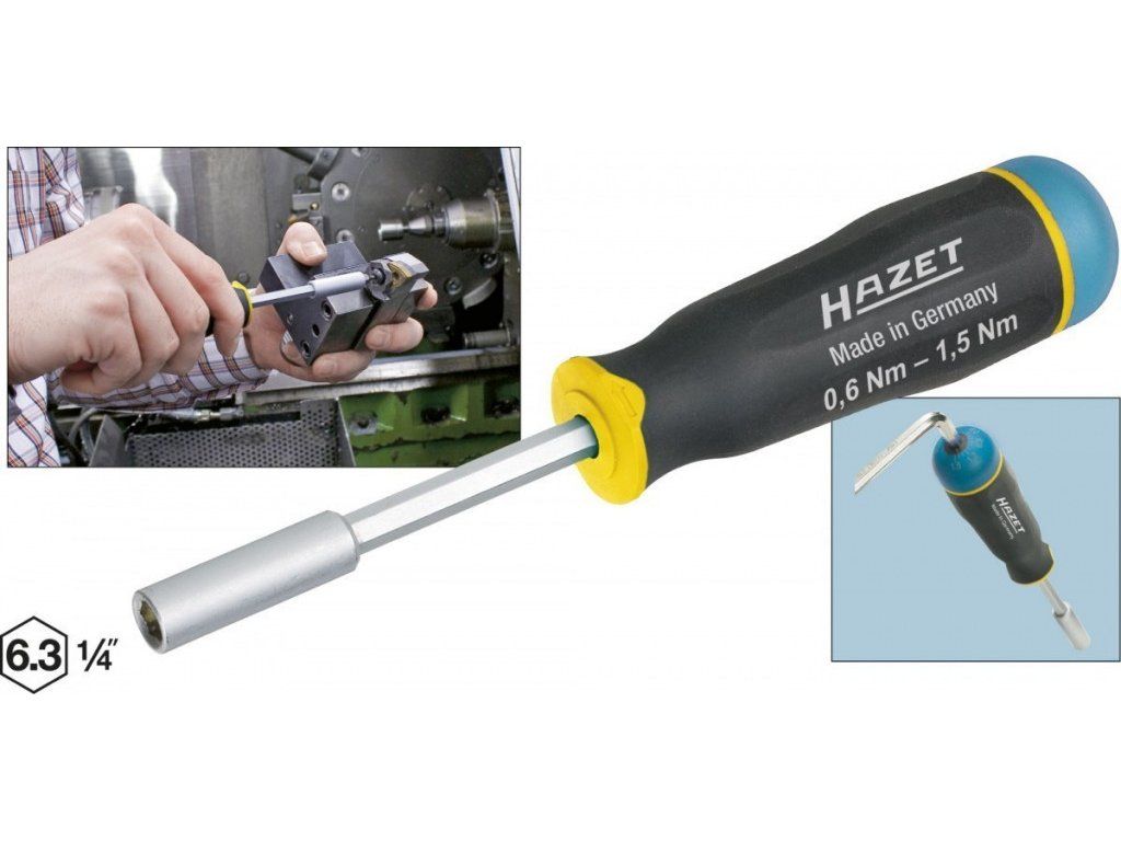 - Rychlé a přesné nastavení hodnoty utahovacího momentu zahnutým šroubovákem (HAZET 2100-06, je součástí dodávky)