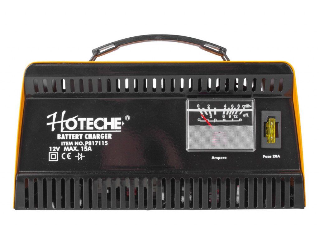 Nabíječka je na čelní straně osazena ampérmetrem ukazujícím aktuální nabíjecí proud a pojistkou 20 A.