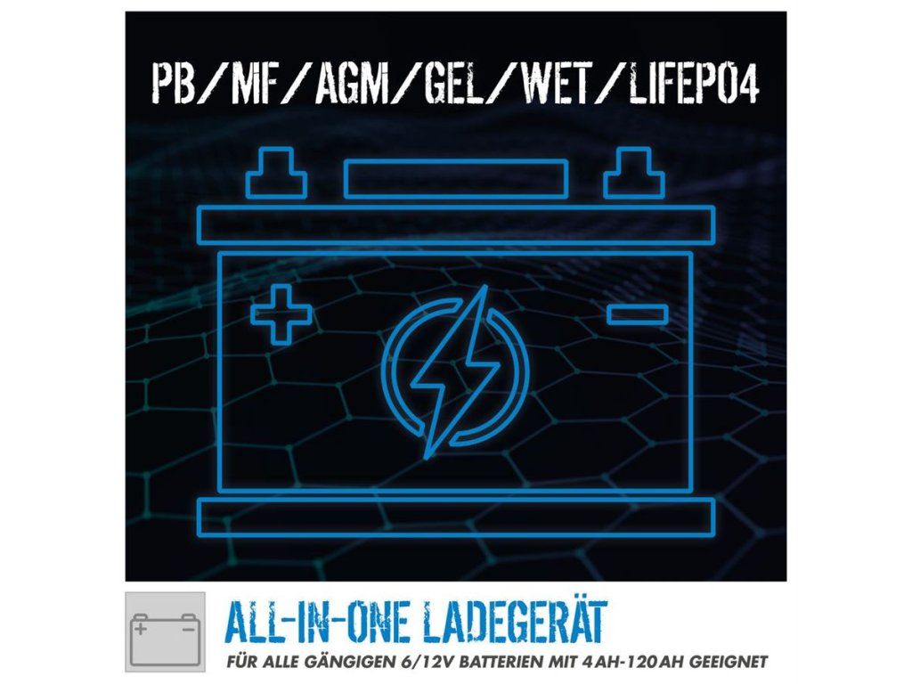- Plně automatické, mikroprocesorem řízené nabíjení údržbových (WET), bezúdržbových (GEL, AGM) i lithiových (LiFePO4) akumulátorů.