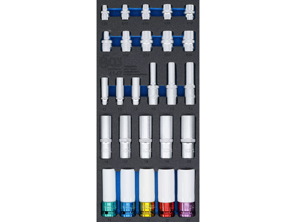 Pěnová vložka o rozměrech (š x h x v) 189 x 408 x 32 mm obsahuje celkem 26 ks nástrčných klíčů 11 - 22 mm, E10 - E22 a klíčů na kola.