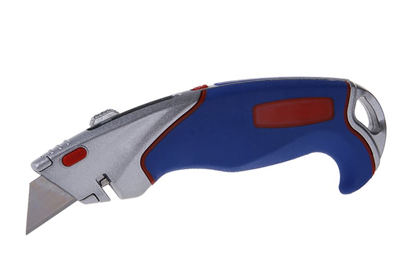 Kovový nůž s výsuvnou lichoběžníkovou čepelí, čepel uchycena uvnitř těla nože na posuvném jezdci, ergonomický tvar, tlačítko pro snadnou a rychlou výměnu čepele, drážka na řezání provázku, odizolovávání vodičů…, 2 náhradní čepele.