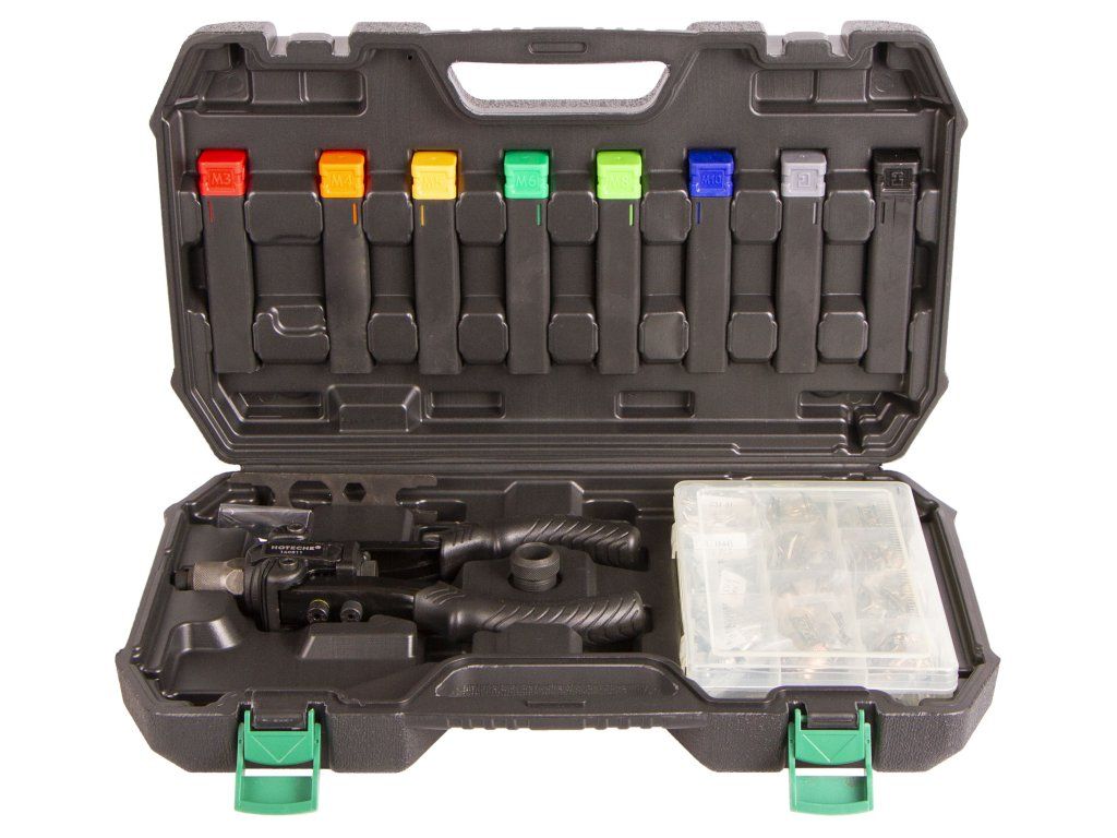 Ruční pákové nýtovací kleště od značky Hoteche v sadě se širokým příslušenstvím.