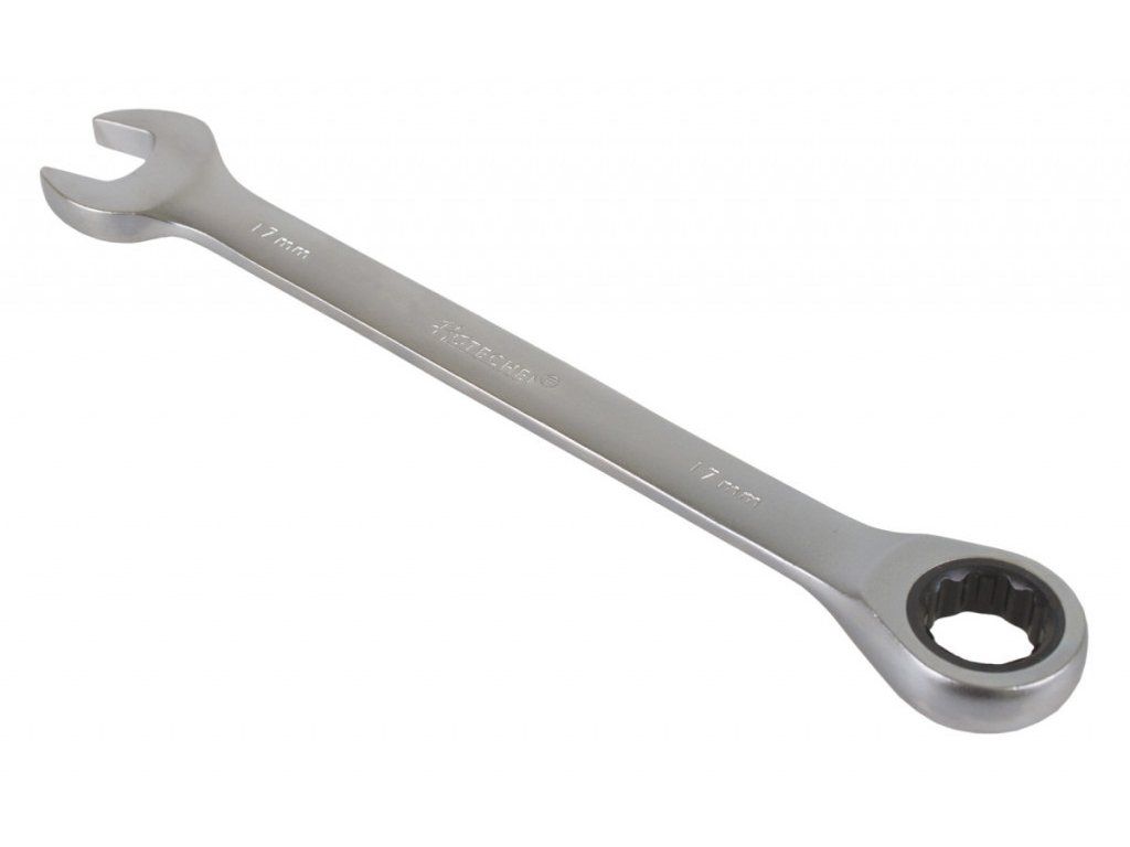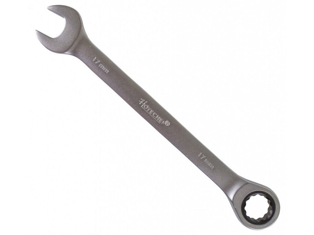 Ráčnový očkoplochý klíč od značky Hoteche o rozměru 17 mm je na jedné straně klasický stranový klíč, na straně druhé očkový klíč s dvanáctihranným profilem vybaveným ráčnou s jemným dělením 72 zubů. Celková délka klíče je 220 mm.