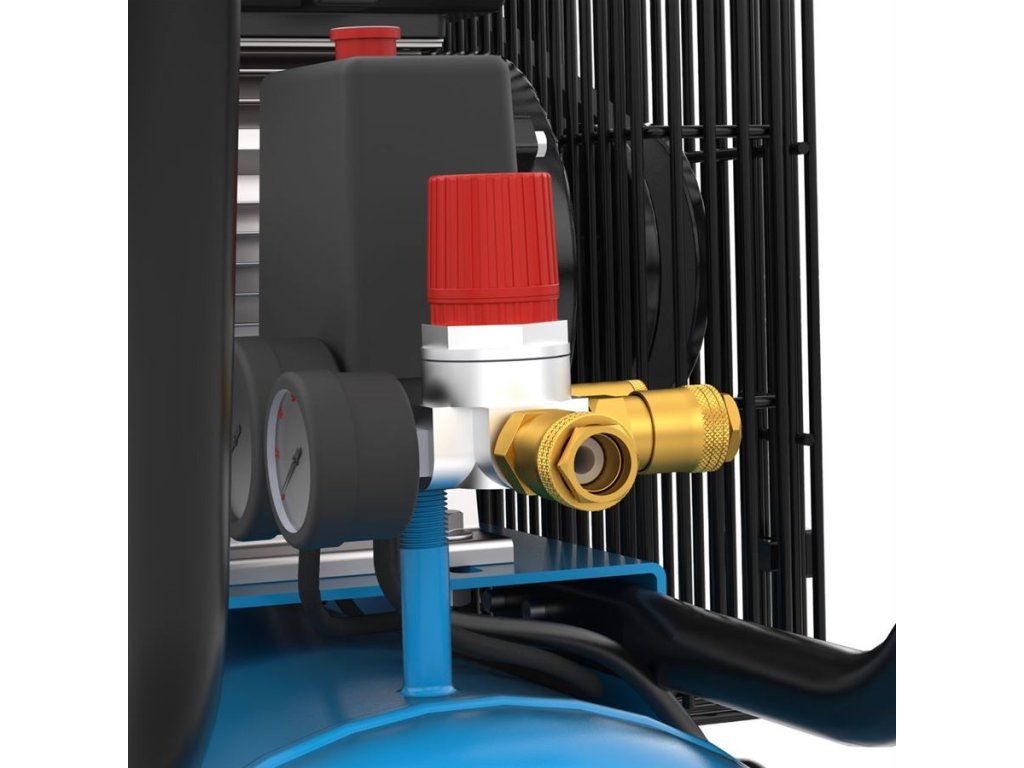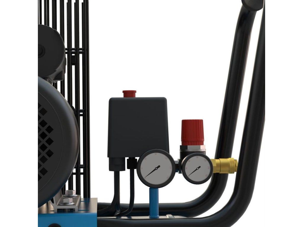 Vybavení: tlakový spínač, 2 manometry (tlak v nádobě / pracovní tlak), 2 výstupy stlačeného vzduchu, redukční ventil, pojistný přetlakový ventil, zpětný ventil, zátka pro vypouštění kondenzátu, integrovaný vzduchový filtr, ochrana proti přetížení, transportní rukojeť.