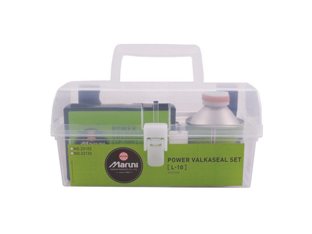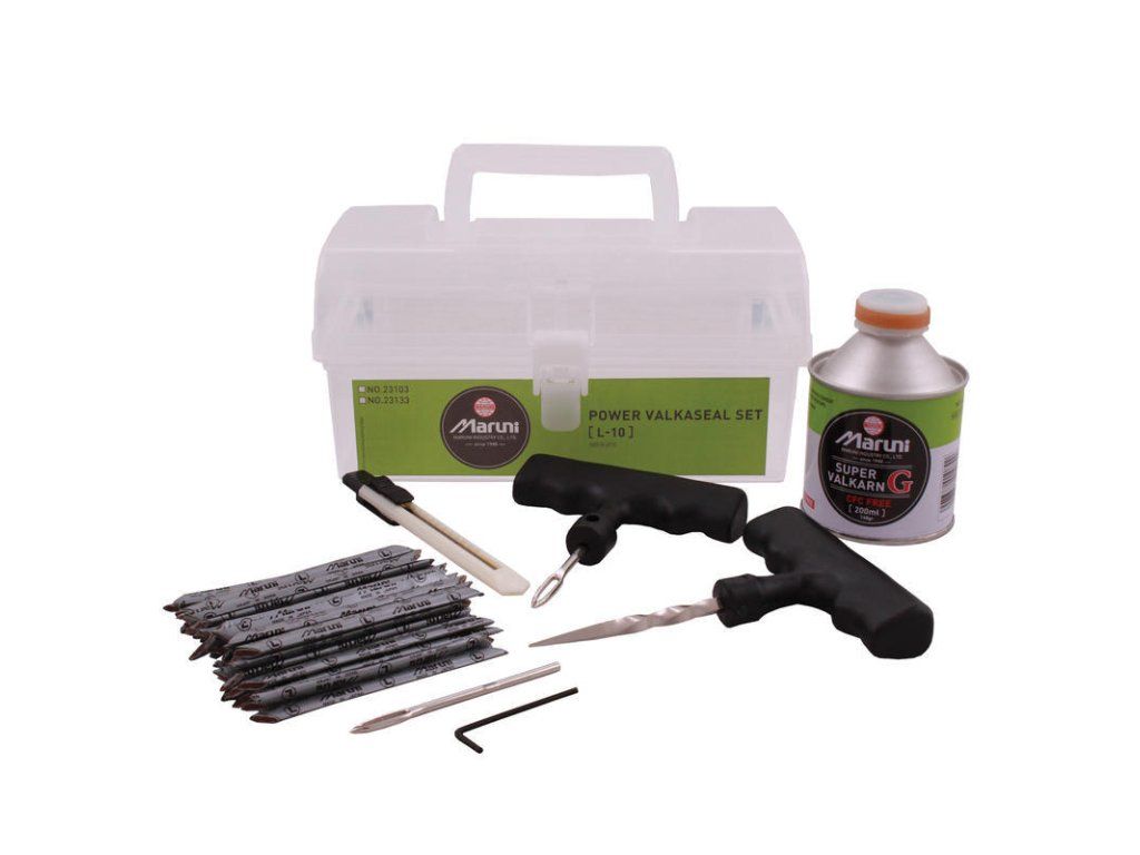 Set obsahuje 50 opravných knotů, vulkanizační roztok a další potřebné nástroje na opravu propíchnutých pneumatik.