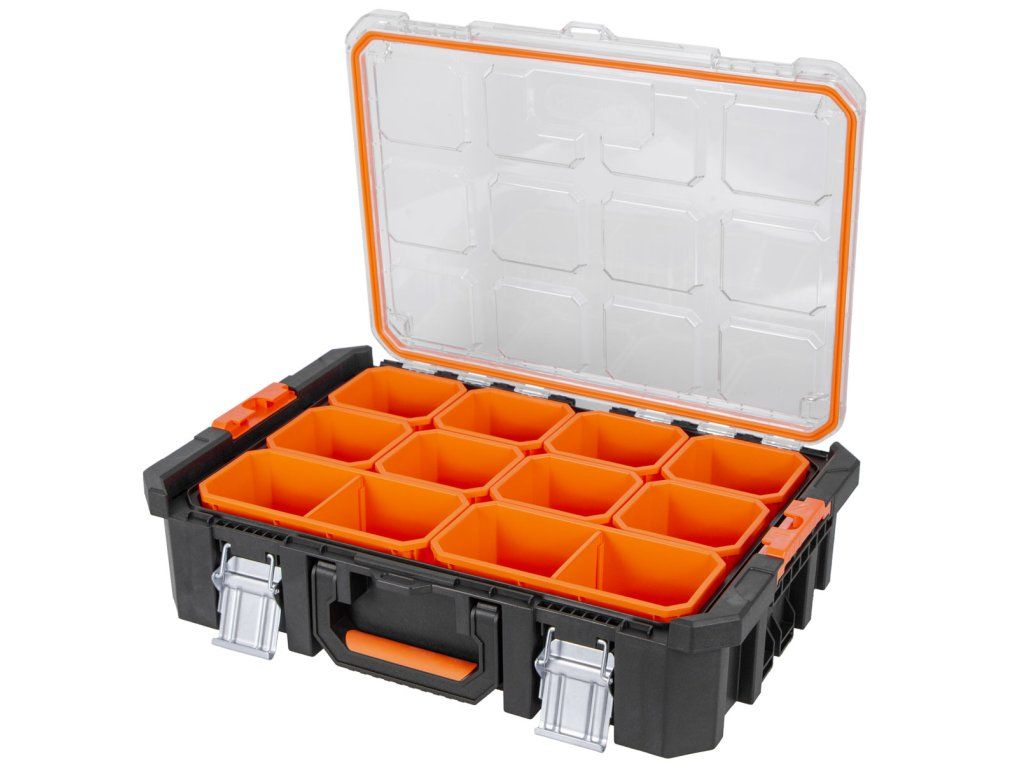 - Průhledný vrchní kryt umožňuje rychlou identifikaci obsahu bez nutnosti otevírání organizéru.