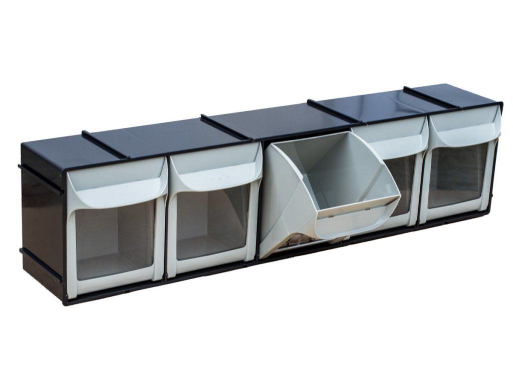 Konstrukce organizéru je vyrobena z odolného tvrdého plastu, který je stálý vůči poškrábání i běžným čisticím prostředkům. Boční drážky umožňují vzájemné spojování více boxů do větších sestav – nad sebe i vedle sebe.