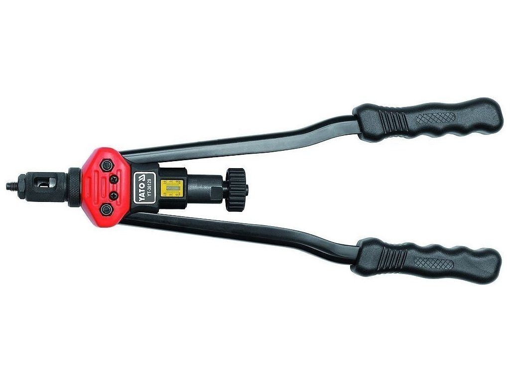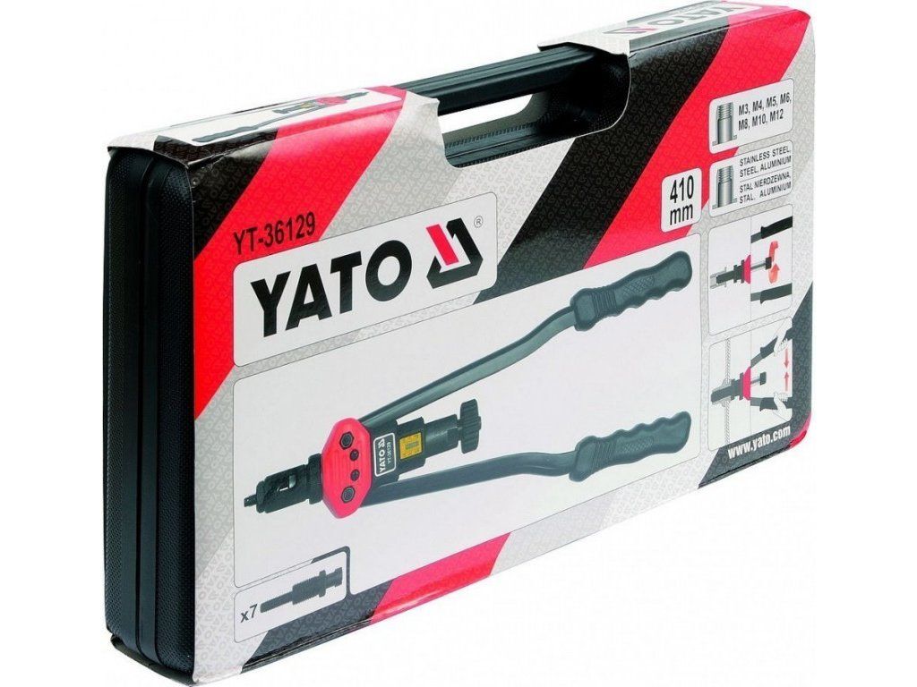 Ruční profesionální nýtovací pákové kleště Yato pro maticové nýty M3 - M12. Obou ruční pákový mechanizmus významně snižuje námahu při práci. Kleště mají celkovou délku 41 cm, což Vám poskytuje dostatečnou páku pro snadné nýtování ocelových, nerezových i hliníkových matic. Kleště s nástavci jsou přehledně uloženy v plastovém kufříku, ideální pro transport.
