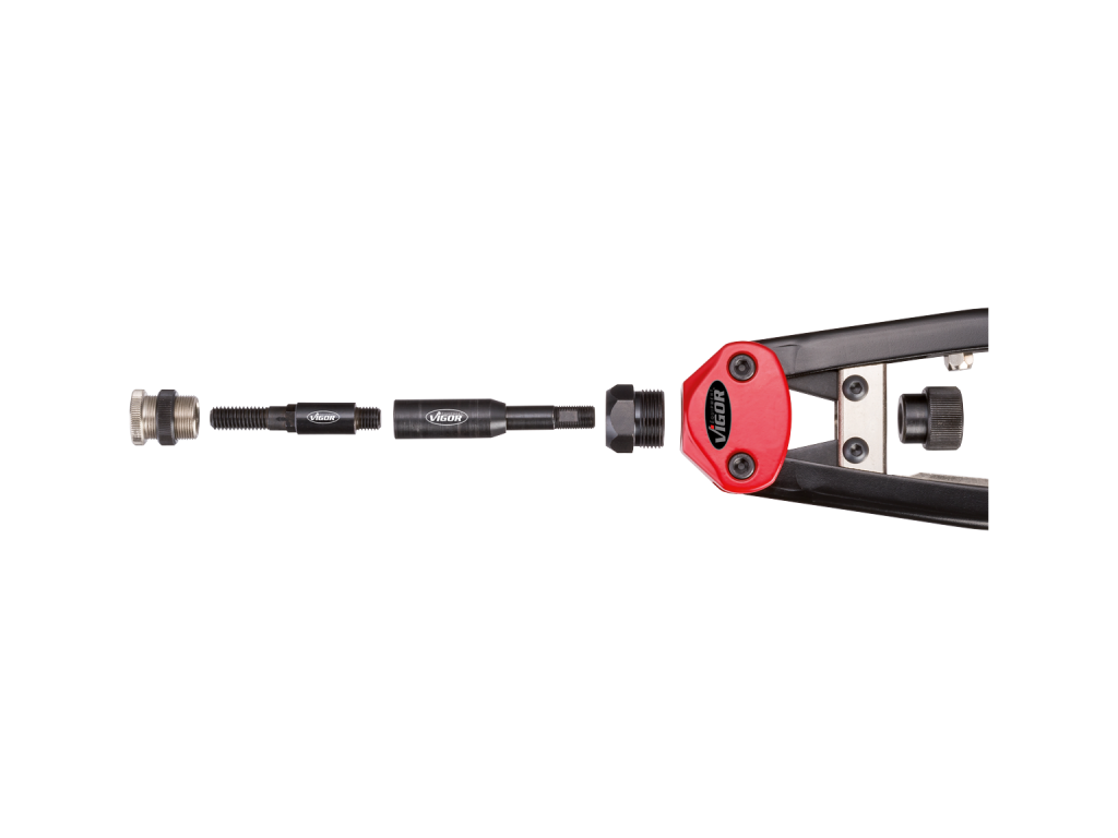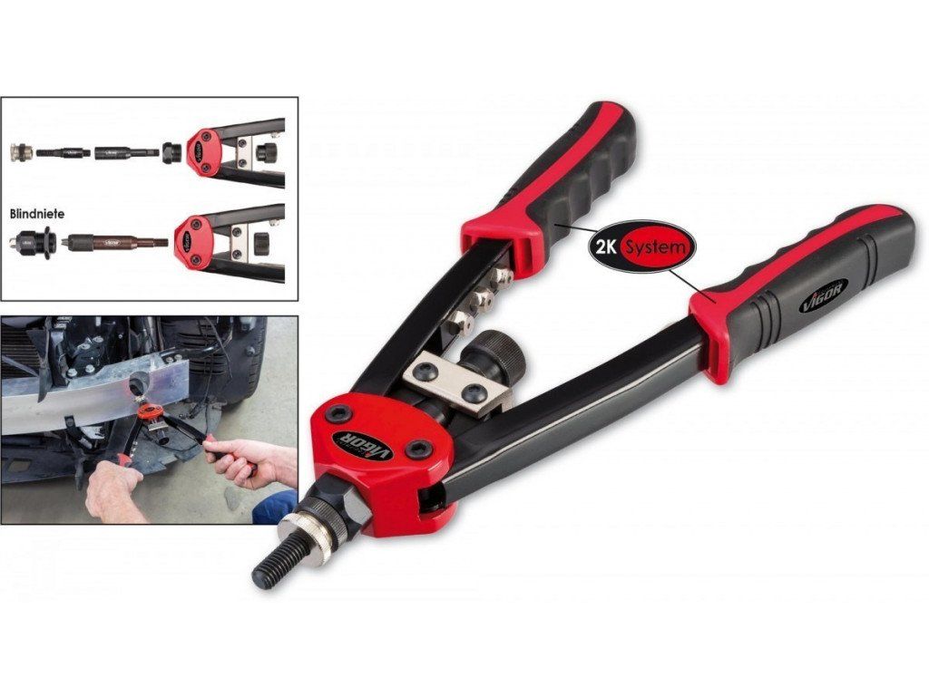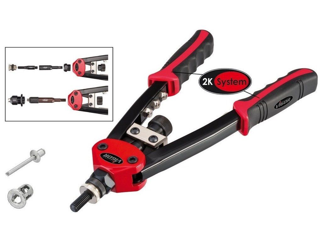 Profesionální nýtovací kleště německé značky Vigor pro práci se slepými nýty i nýtovacími maticemi. Roznýtujete měděné, mosazné, ocelové a nerezové nýty. Celková délka kleští je 32 cm.