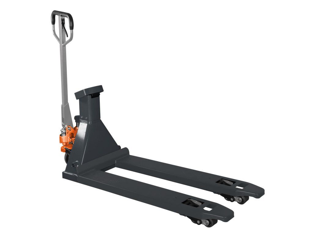 Profesionální paletový vozík se zvedací silou 2,5 tuny a integrovanou elektronickou váhou a tiskárnou, vhodný jako kontrolní váha pro každodenní použití.