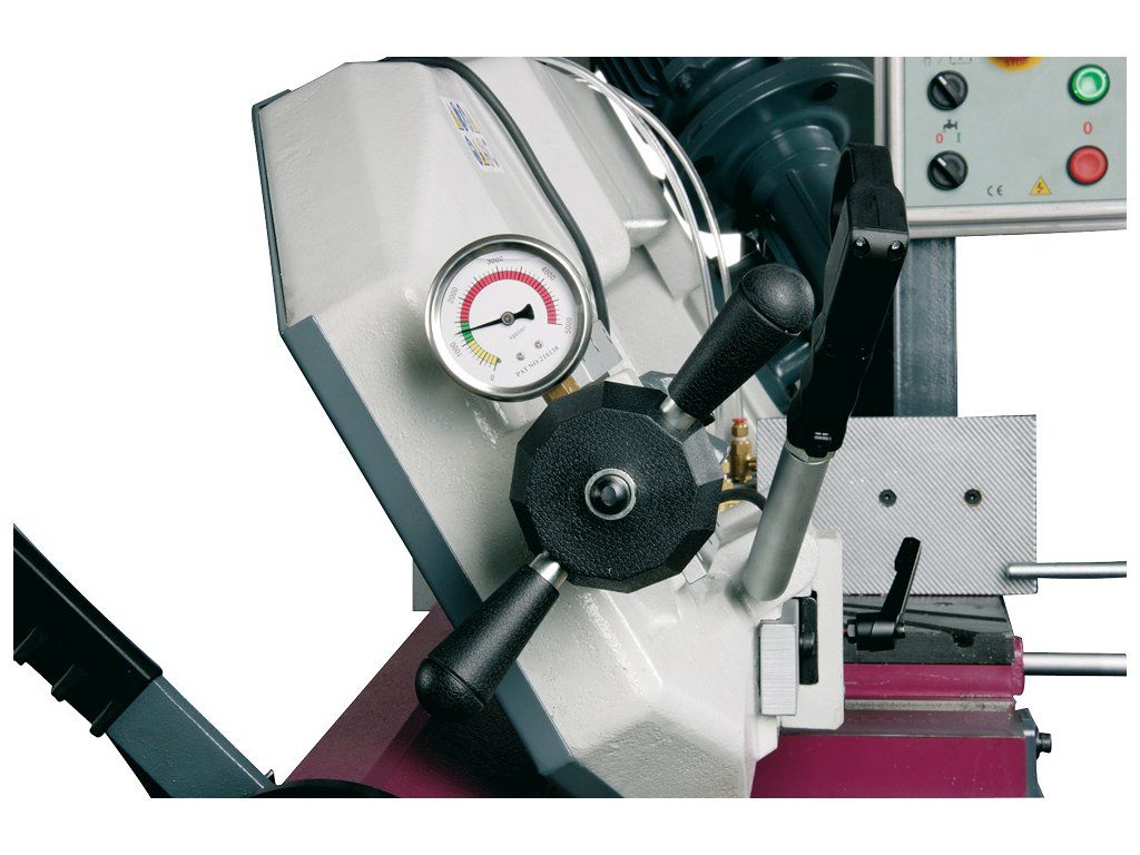 Dvourychlostní profesionální pásová pila na řezání kovu s úhlováním pomocí otočného ramene.- Těžké litinové provedení