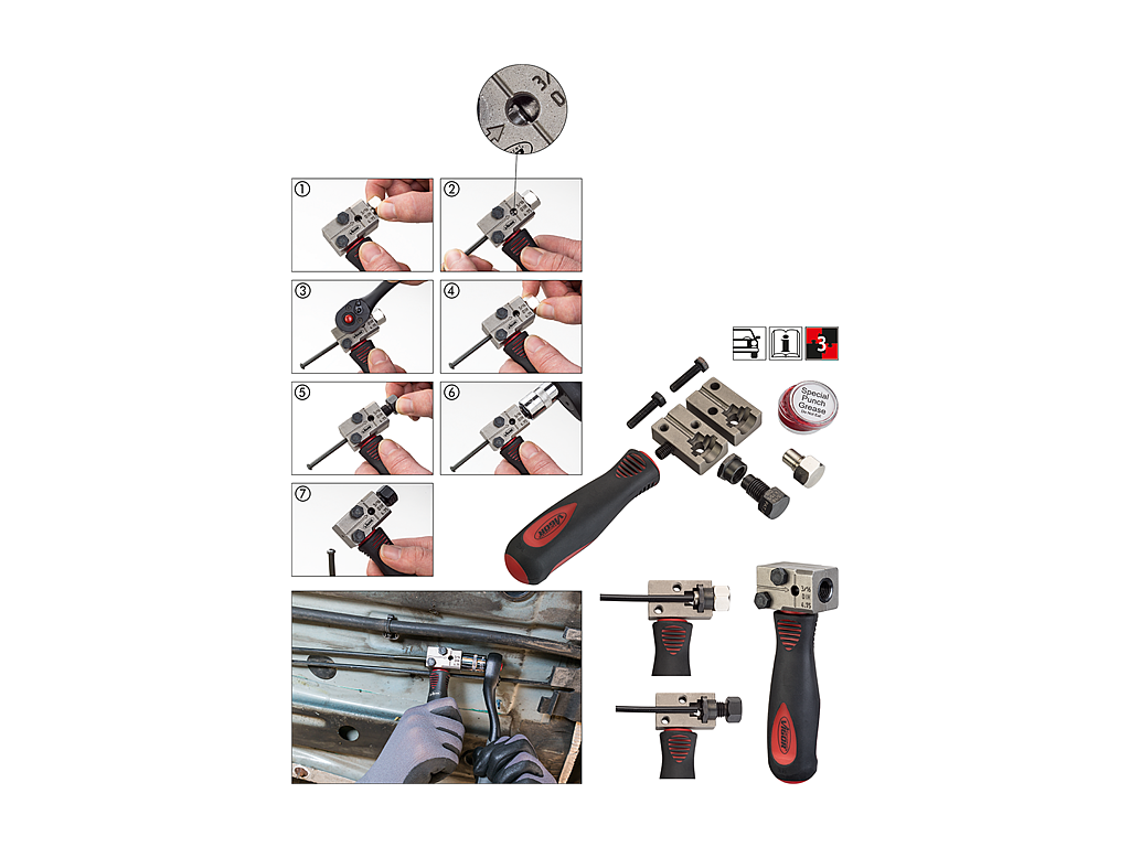 - Pertlovačka pro snadné a přesné DIN pertlování brzdových trubek přímo na vozidle.