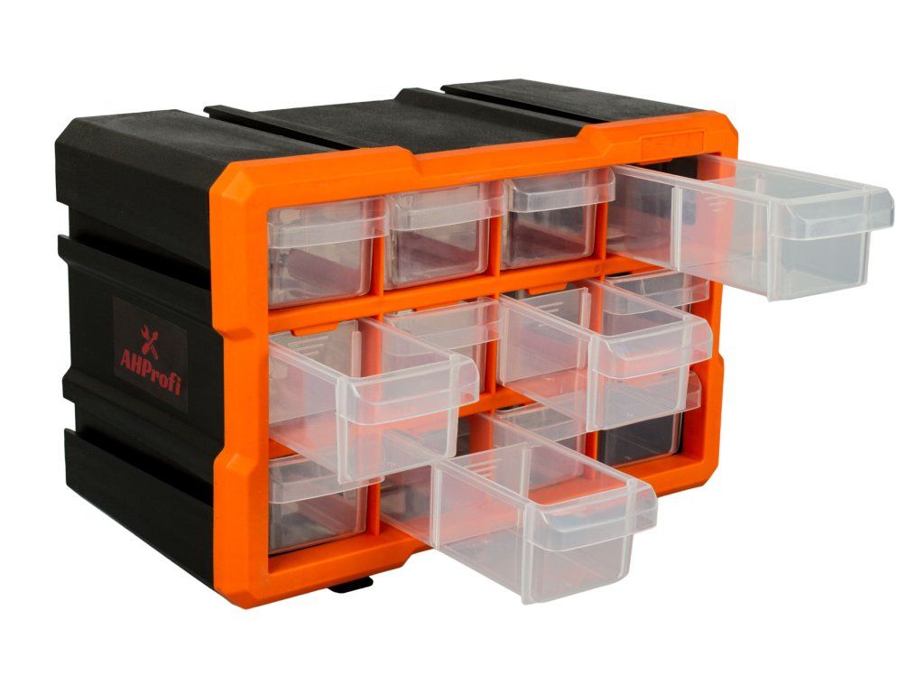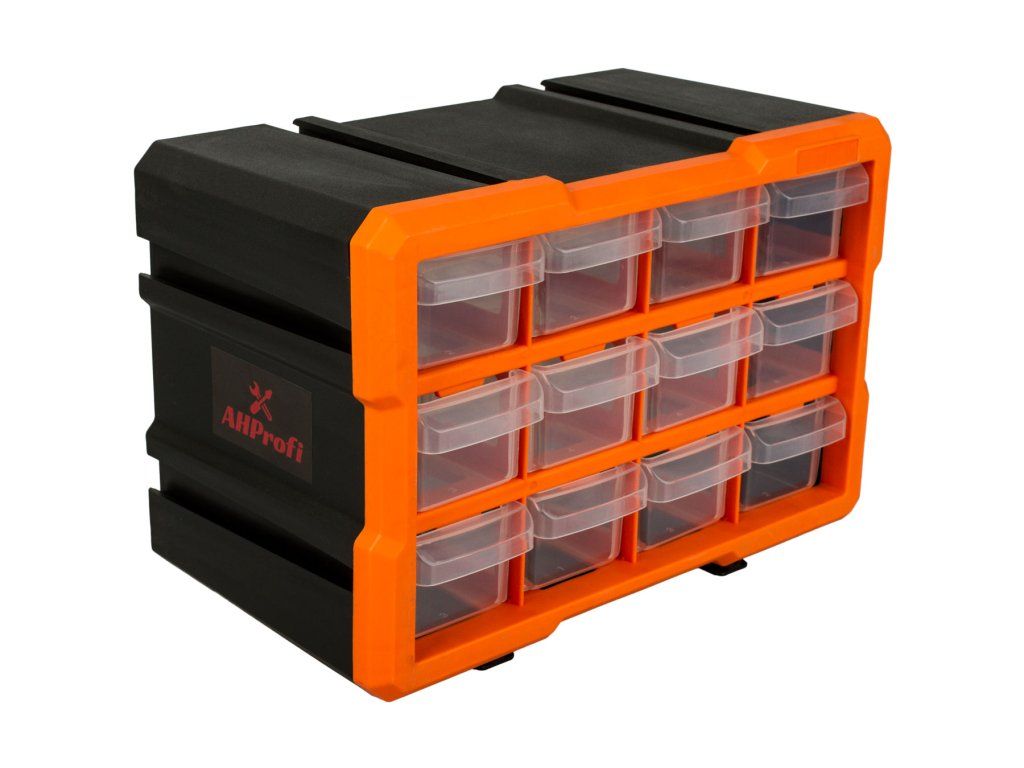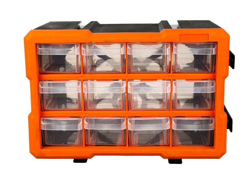 Plastový organizér s 12-ti malými průhlednými boxy, vhodný např. pro uskladnění a přehledné rozdělení šroubků, matic a dalšího nářadí, které by se mohlo zakutálet a ztratit. Každý box má jednu přepážku, kterou můžete vyndat, takže si u každého boxíku můžete vybrat, jestli chcete jedno nebo dvě skladovací místa.