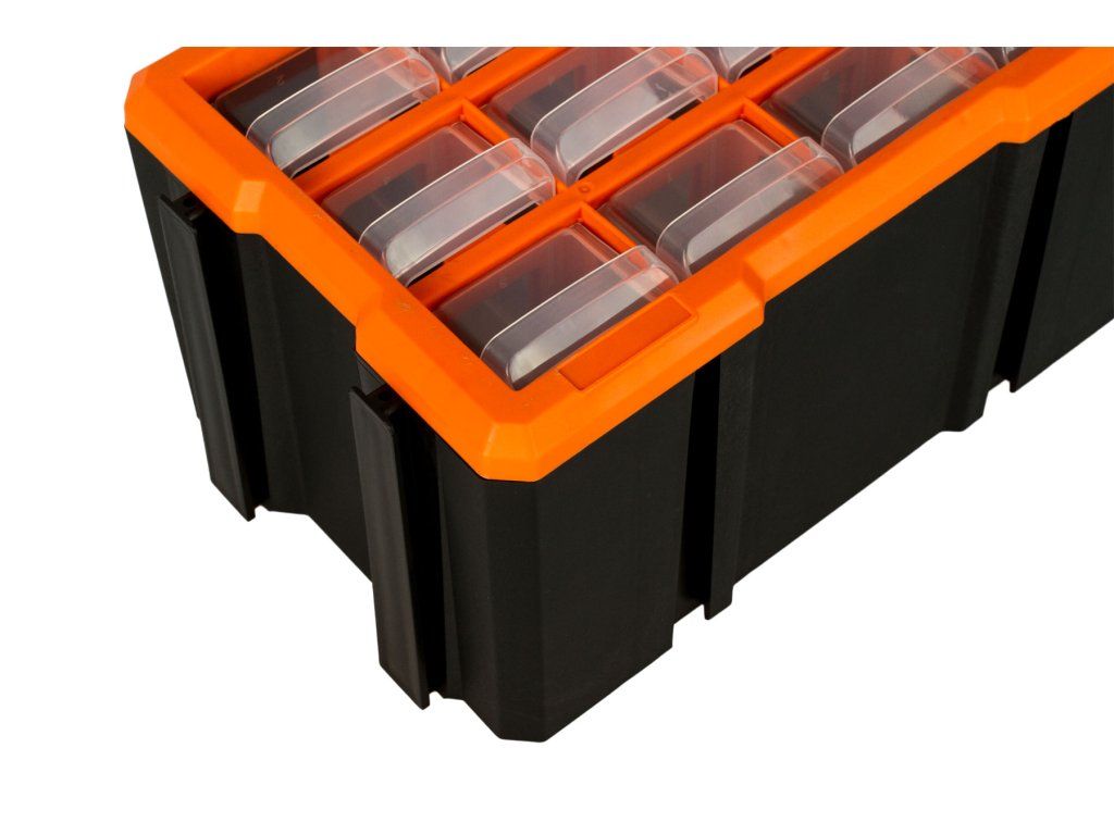 Plastový box má přepážku, kterou lze vyndat a mít jedno větší skladovací místo. Vhodný pro skladování a roztřídění šroubků, matic i většího nářadí. Box lze snadno vytáhnout z organizéru a zase jej vrátit zpět.