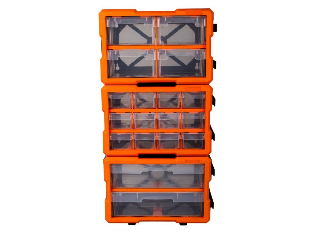 Plastové organizéry jsou lehce připojitelné a můžete organizéry složit a poskládat podle vašich představ (udělat z nich např. "stěnu", ve které budeme mít hezky uskladněny, a přehledně rozděleny např. šroubky, matice, či jiné drobné nářadí).