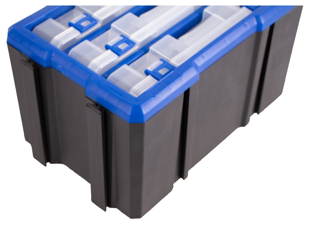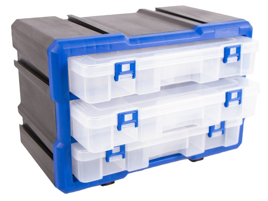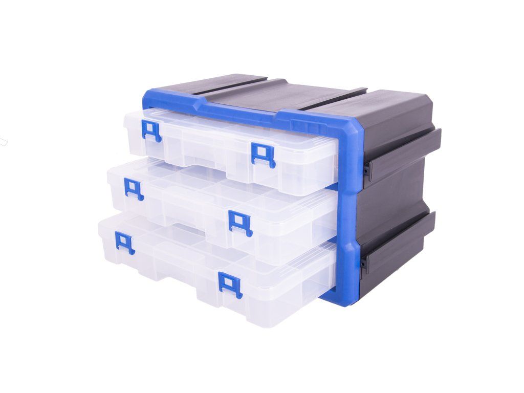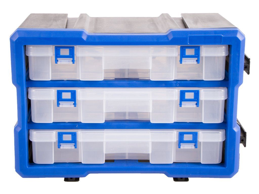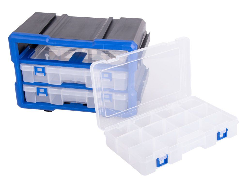 Plastový organizér se 3 uzavíratelnými průhlednými boxy, vhodný např. pro uskladnění a přehledné rozdělení šroubků, matic a dalšího nářadí, které by se mohlo zakutálet a ztratit. Každý box má 12 přepážek, které můžete libovolně kombinovat a uzpůsobit si prostor dle svých potřeb.