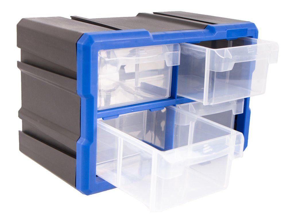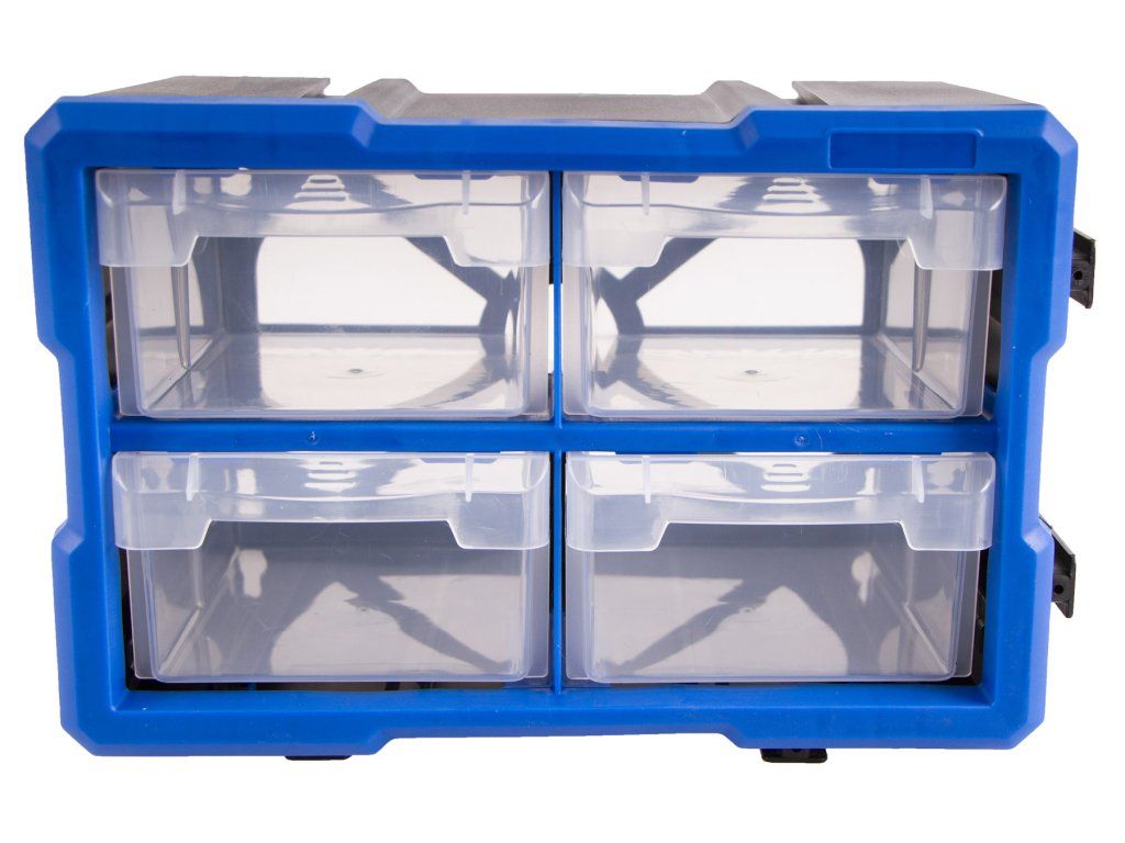 Plastový organizér se 4-mi středně velkými průhlednými boxy, vhodný např. pro uskladnění a přehledné rozdělení šroubků, matic a dalšího nářadí, které by se mohlo zakutálet a ztratit. Každý box má jednu přepážku, kterou můžete vyndat, takže si u každého boxíku můžete vybrat, jestli chcete jedno nebo dvě skladovací místa.