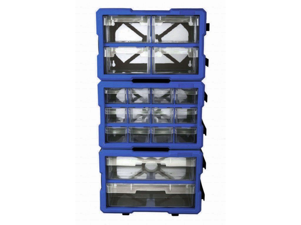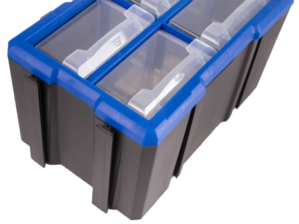 Plastový box má přepážku, kterou lze vyndat a mít jedno větší skladovací místo. Vhodný pro skladování a roztřídění šroubků, matic i většího nářadí. Box lze snadno vytáhnout z organizéru a zase jej vrátit zpět.