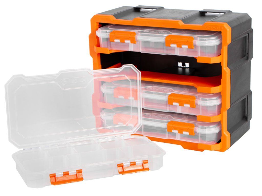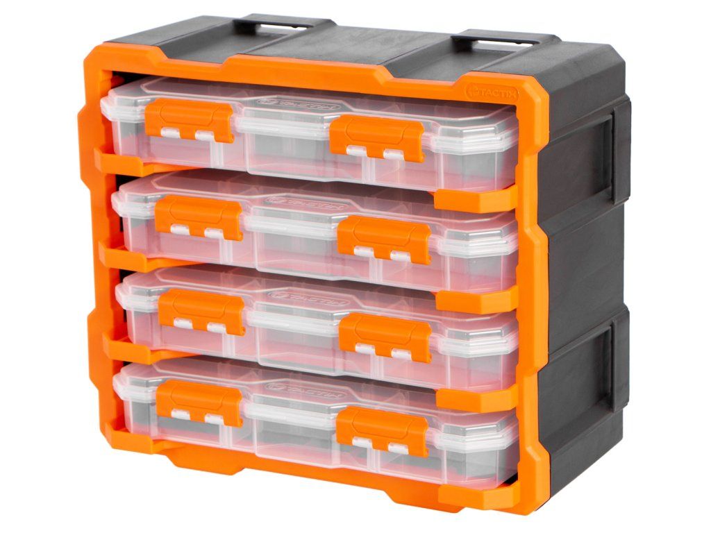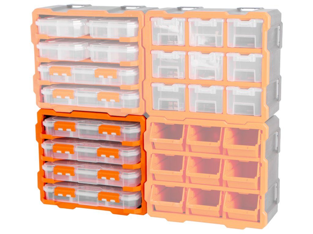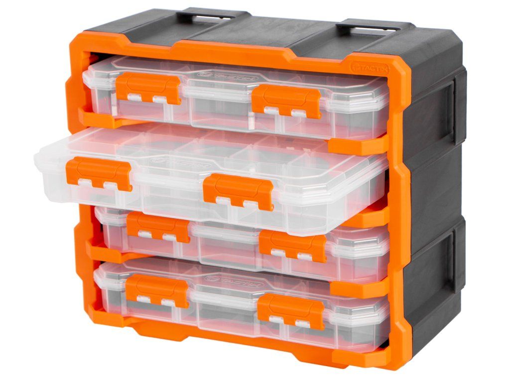 Obsahuje 4 transparentní boxy, každý s 13 přizpůsobitelnými přihrádkami a dvojicí bezpečnostních západek proti samovolnému otevření.