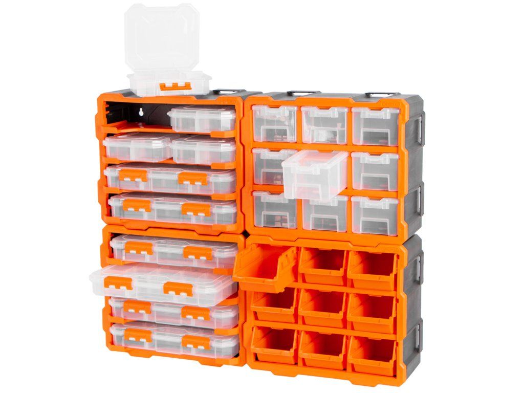 Praktický organizér navržený pro přehledné uložení drobného nářadí, spojovacího materiálu nebo domácích potřeb.