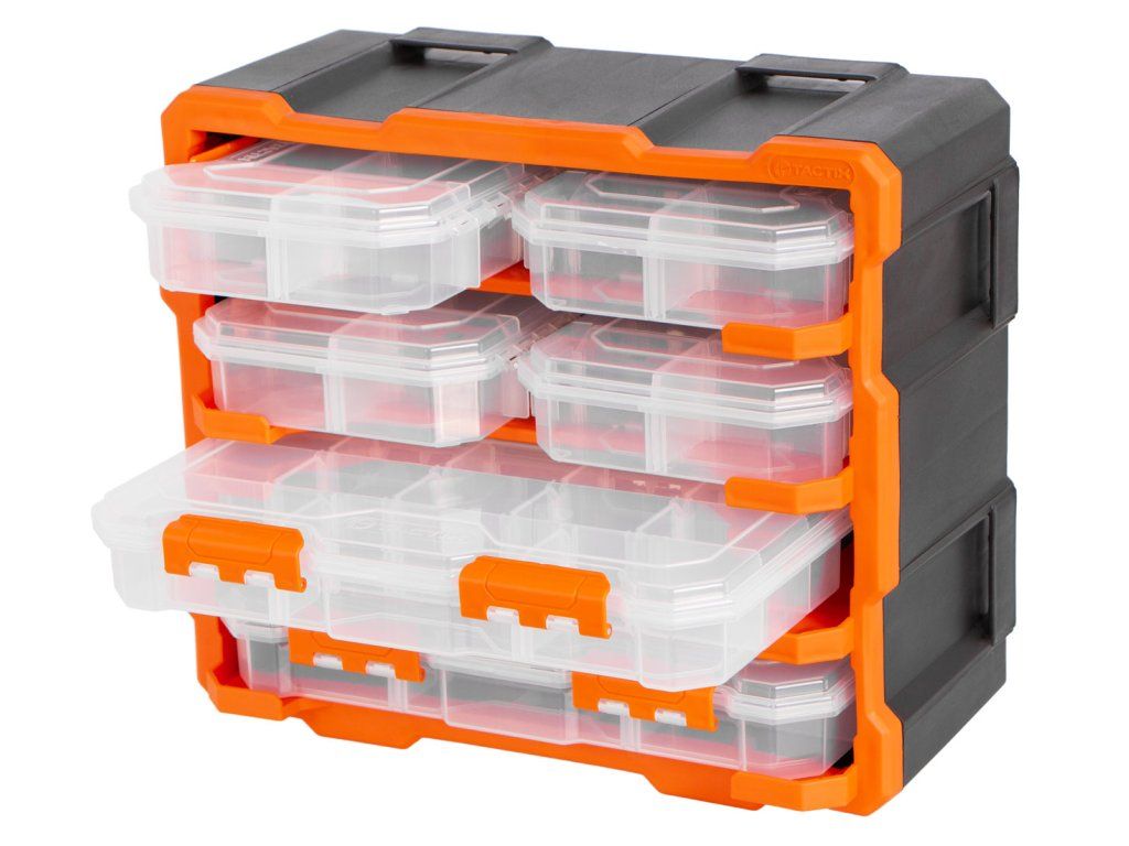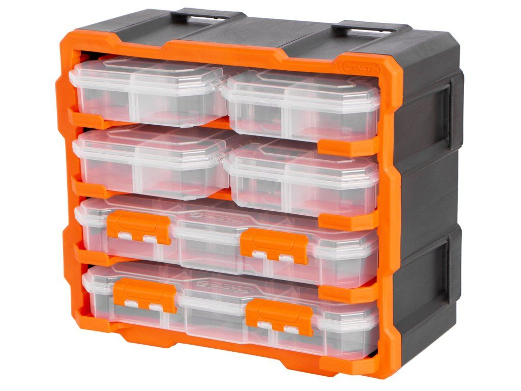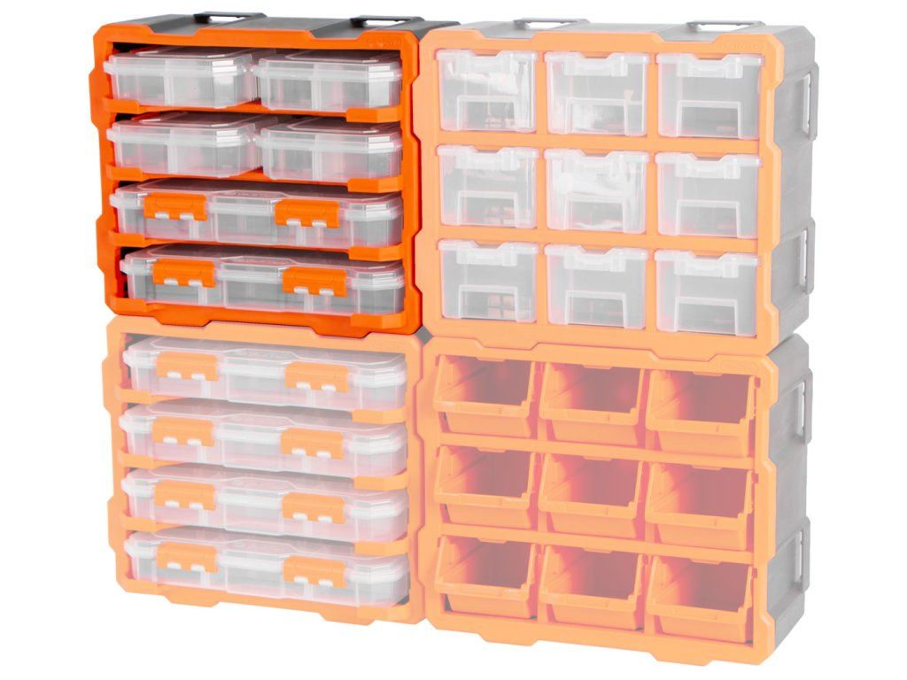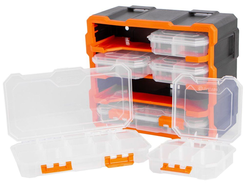 Praktický organizér navržený pro přehledné a bezpečné uložení spojovacího materiálu, drobného nářadí a dalších komponentů v domácích i profesionálních dílnách.