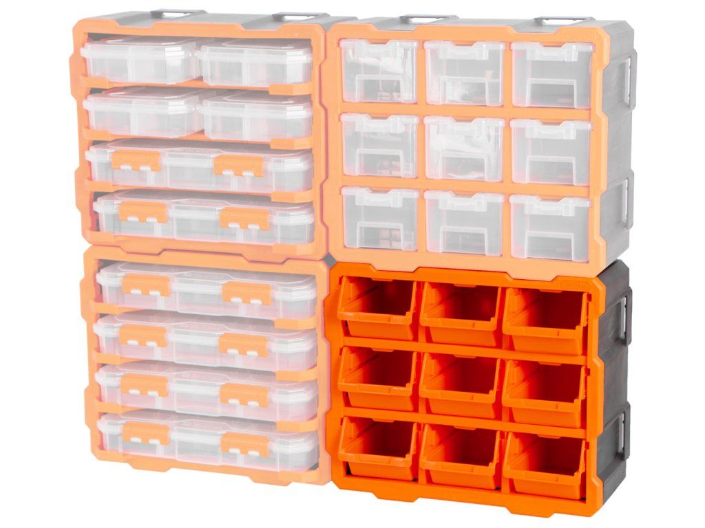 Univerzální plastový organizér pro efektivní uložení a třídění drobného spojovacího materiálu, příslušenství a součástek v dílnách, garážích i domácnostech.