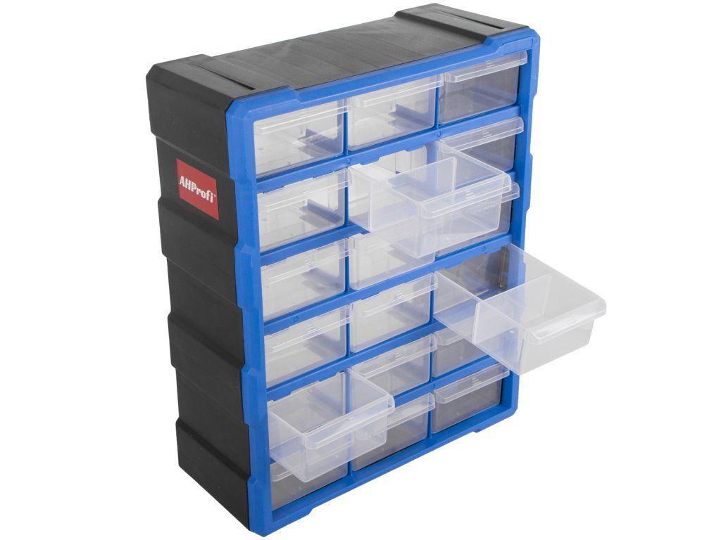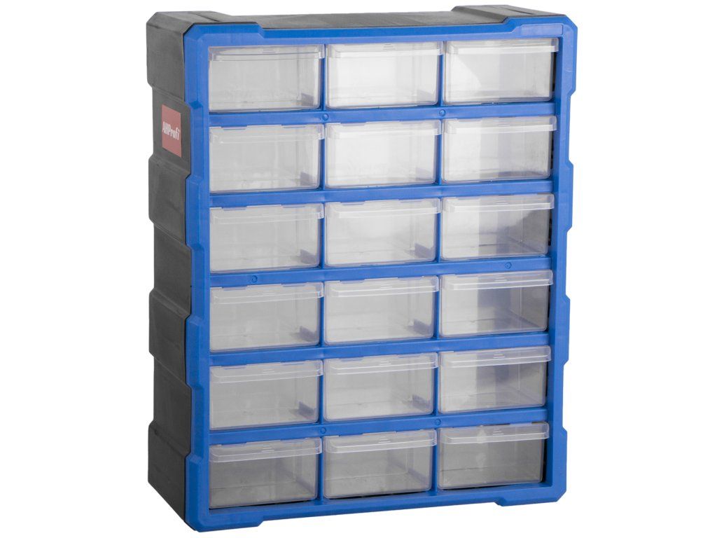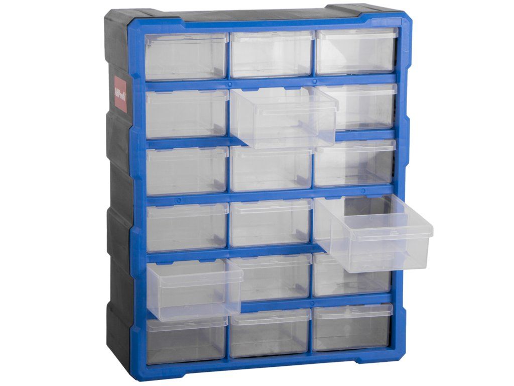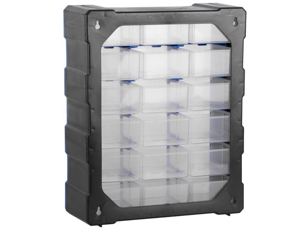 Plastový organizér s 18 zásuvkami lze jednoduše zavěsit na zeď, nebo např. z boku skříně, dílenského vozíku apod. Je možné ho postavit na ponk, nebo pracovní stůl a slouží pro uložení montážního materiálu a drobného dílenského vybavení.