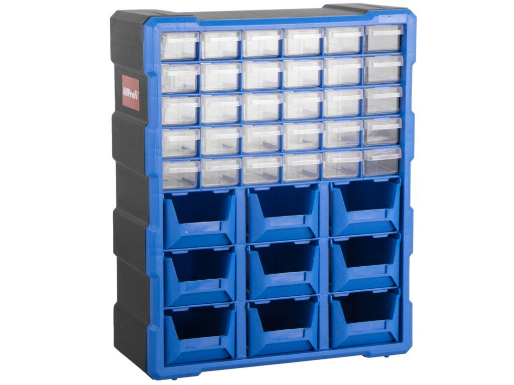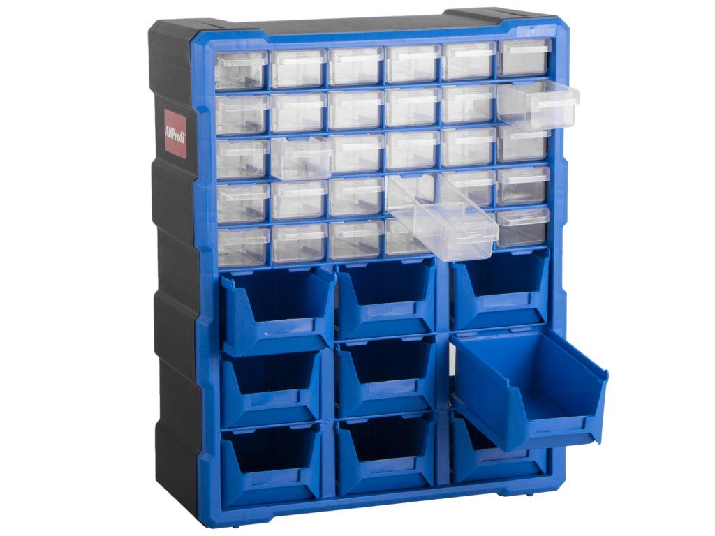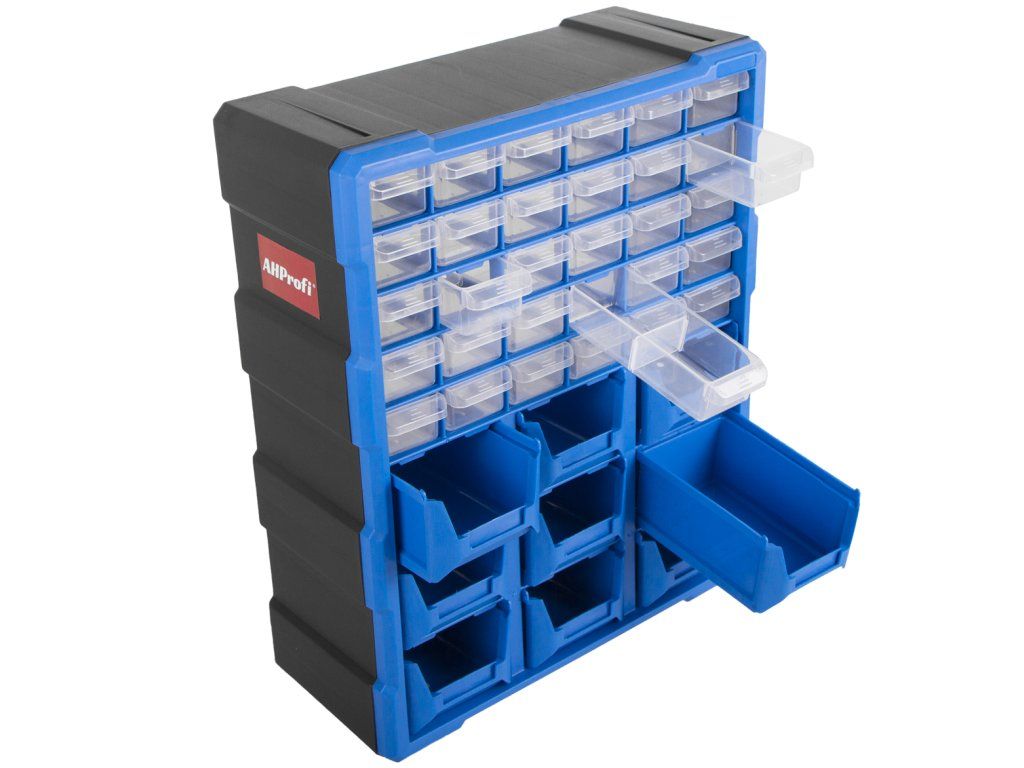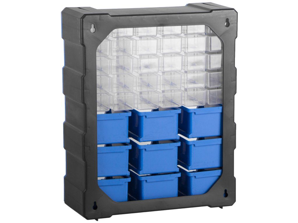 Plastový organizér s 39 zásuvkami lze jednoduše zavěsit na zeď, nebo např. z boku skříně, dílenského vozíku apod. Je možné ho postavit na ponk, nebo pracovní stůl a slouží pro uložení montážního materiálu a drobného dílenského vybavení.