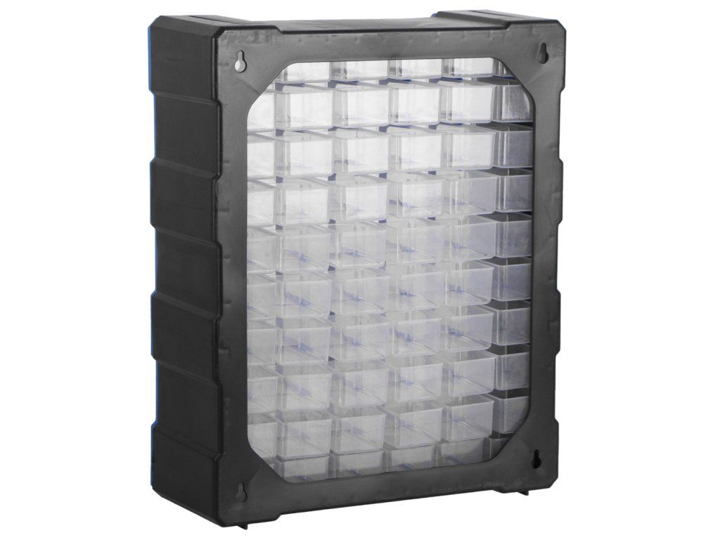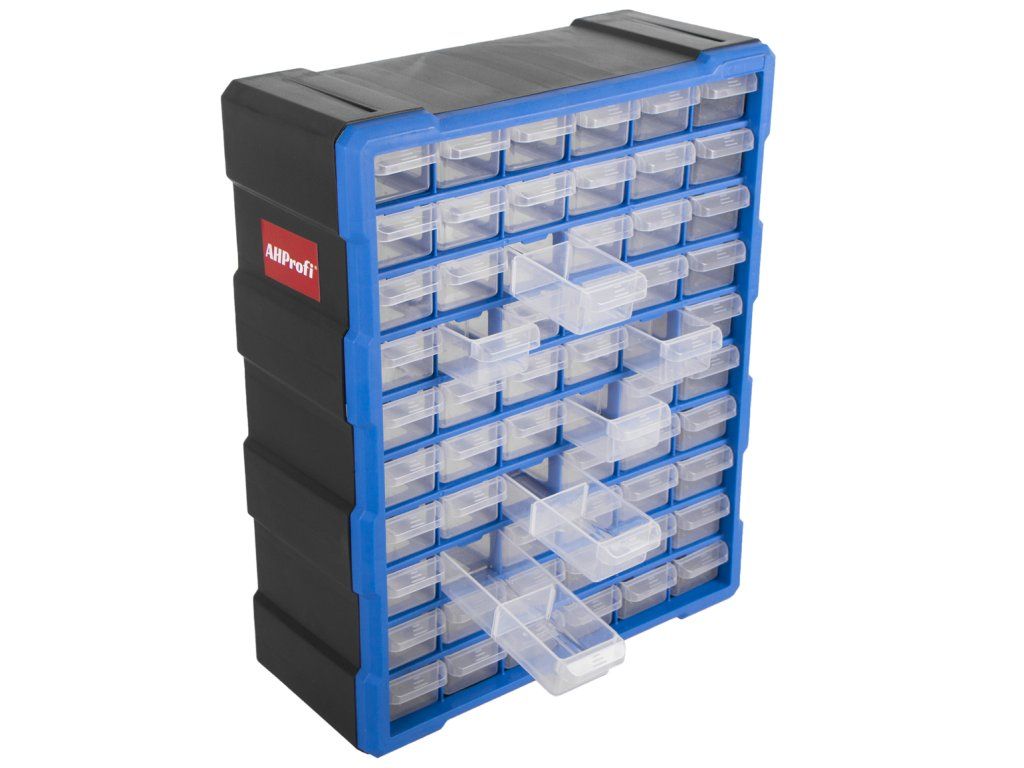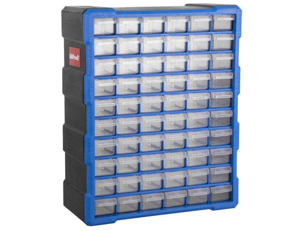 Plastový organizér s 60 zásuvkami lze jednoduše zavěsit na zeď, nebo např. z boku skříně, dílenského vozíku apod. Je možné ho postavit na ponk, nebo pracovní stůl a slouží pro uložení montážního materiálu a drobného dílenského vybavení.