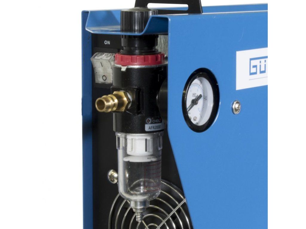 Konstrukce: plášť z ocelového plechu, redukční ventil s filtrem, manometr, ventilátor, transportní držadlo.
